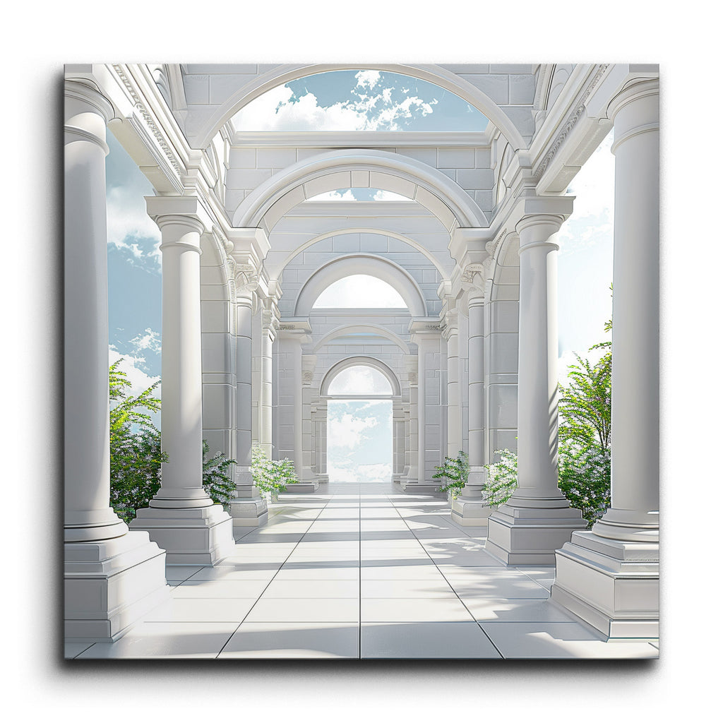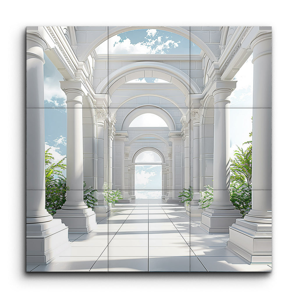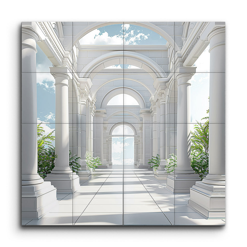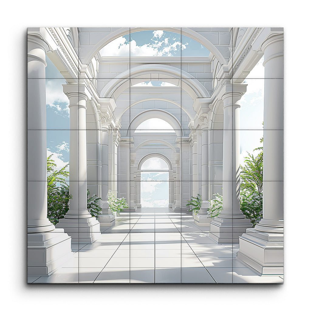 Transform your space with this captivating tile mural, showcasing a classical architectural scene. The artwork features grand arches and robust columns with intricate Greco-Roman capitals, all depicted with stunning realism and symmetry. The perspective draws the eye towards a distant vanishing point, enhancing the depth and harmony of the composition. Soft, natural lighting and a serene sky add to the timeless atmosphere, while lush green plants provide a vibrant contrast. This mural exudes tranquility and grandeur, perfect for any sophisticated setting.