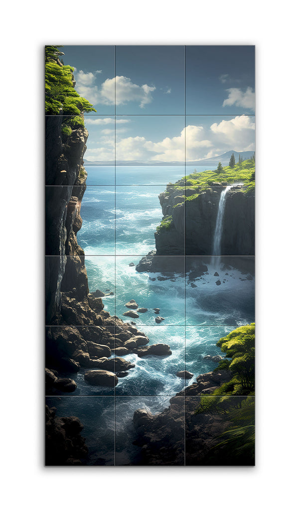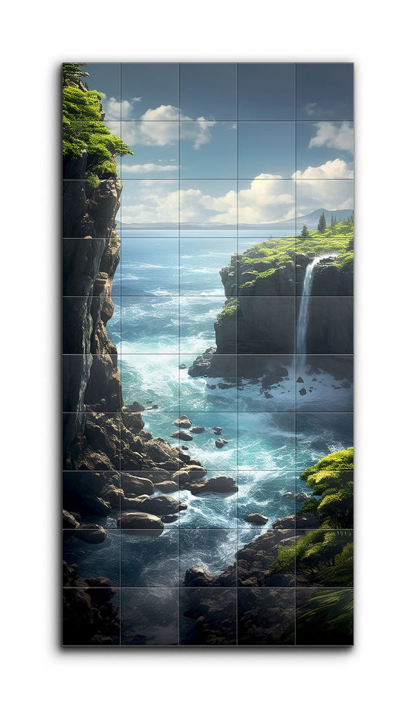 This tile mural captures a breathtaking coastal landscape with dramatic cliffs and a serene seascape. On the left, a towering cliff with lush greenery sharply descends into the ocean, where waves crash energetically against the rocks. On the right, a slightly lower cliff features a stunning waterfall that cascades into vibrant turquoise waters, merging with the deeper blue sea. The clear blue sky with scattered fluffy clouds enhances the vivid colors and realistic textures, creating a harmonious and awe-inspiring scene.