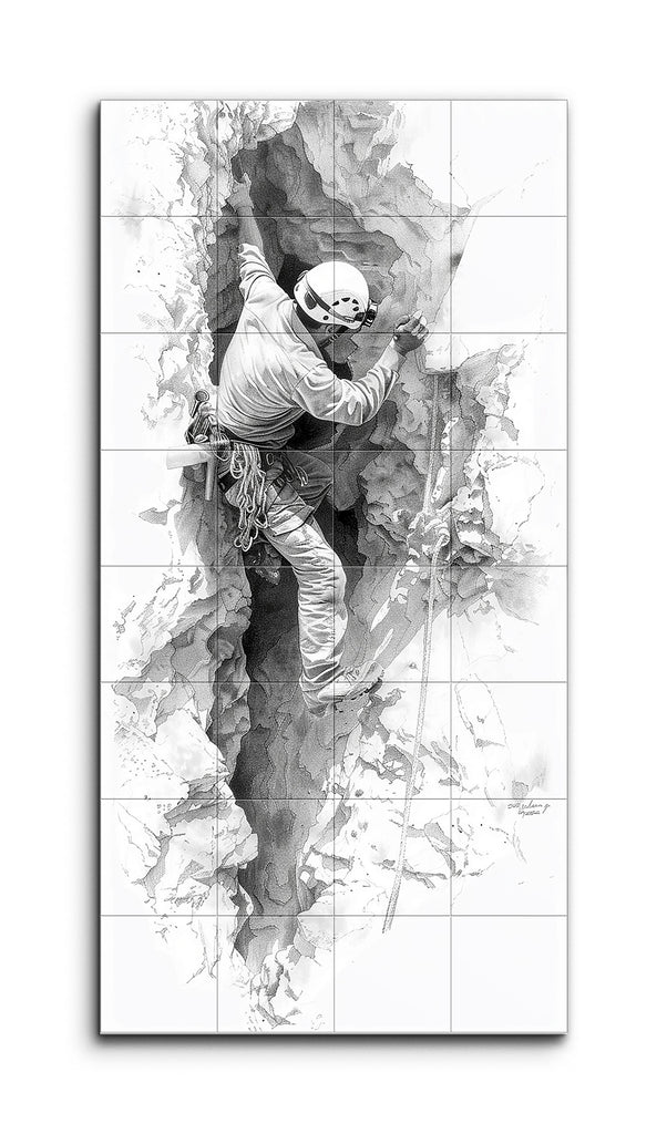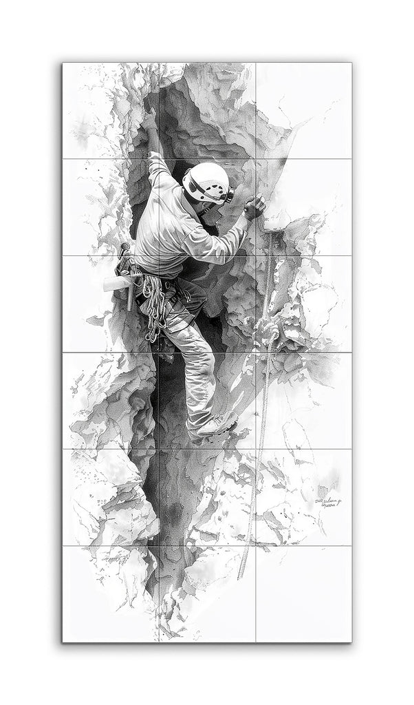 This tile mural captures a climber navigating a narrow crevice in rugged terrain. Dressed in detailed climbing gear, the climber reaches up to grasp a rock, balancing skillfully with braced legs. The realistic style emphasizes the textures of the rocky surfaces and the climber’s attire, with meticulous shading and contrast. The intricate lines and varying gray shades of the rocks, alongside the folds and creases in the clothing, bring depth and dimension to this scene of intense focus and physical exertion.