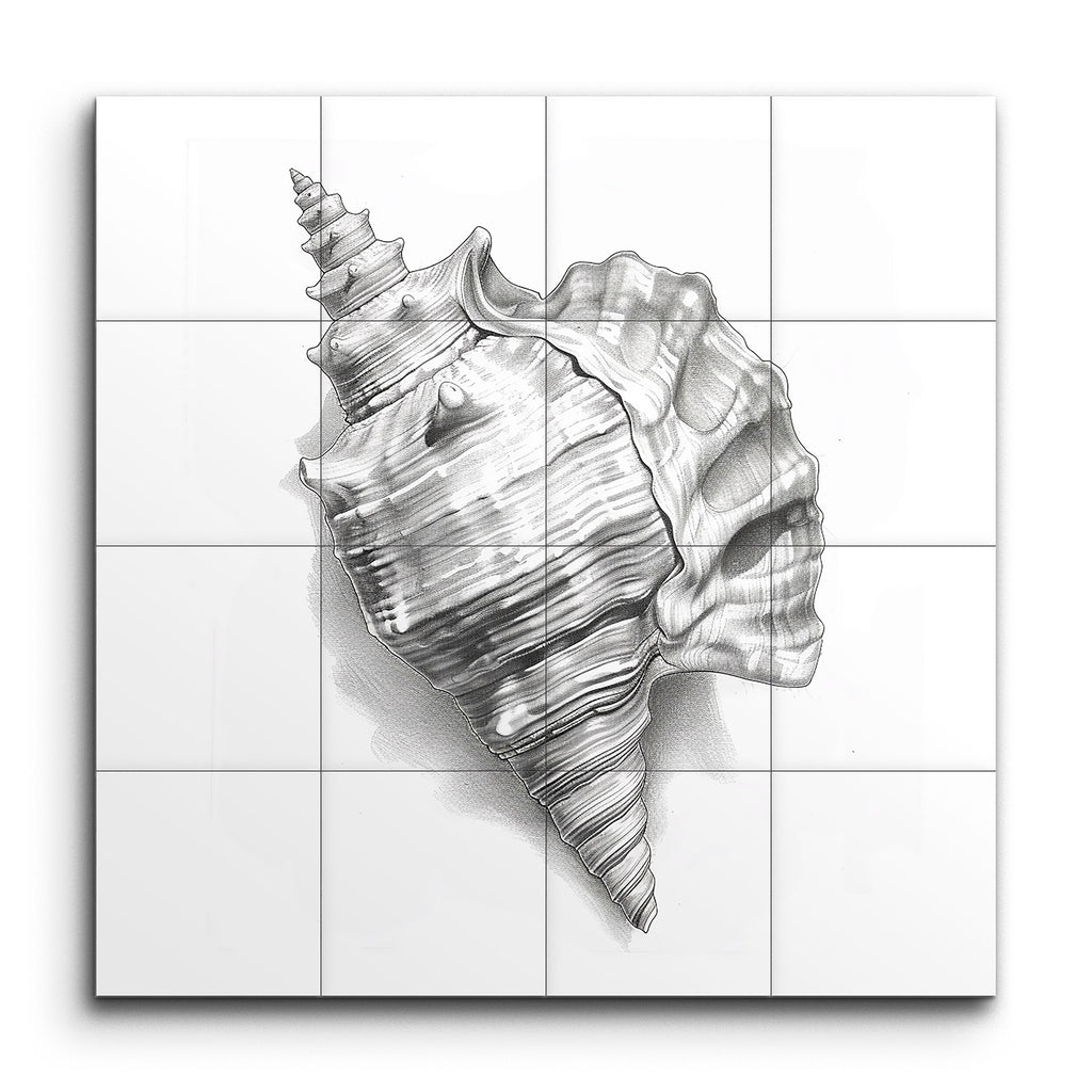 This tile mural showcases a meticulously detailed rendering of a conch shell. Every ridge and groove is highlighted, giving it a striking three-dimensional appearance. The expert use of shading and highlights emphasizes the shell's form and the interplay of light on its surface, creating a profound sense of depth and realism. The grayscale tones enhance its naturalistic and precise style, making it reminiscent of scientific illustrations or highly realistic drawings.