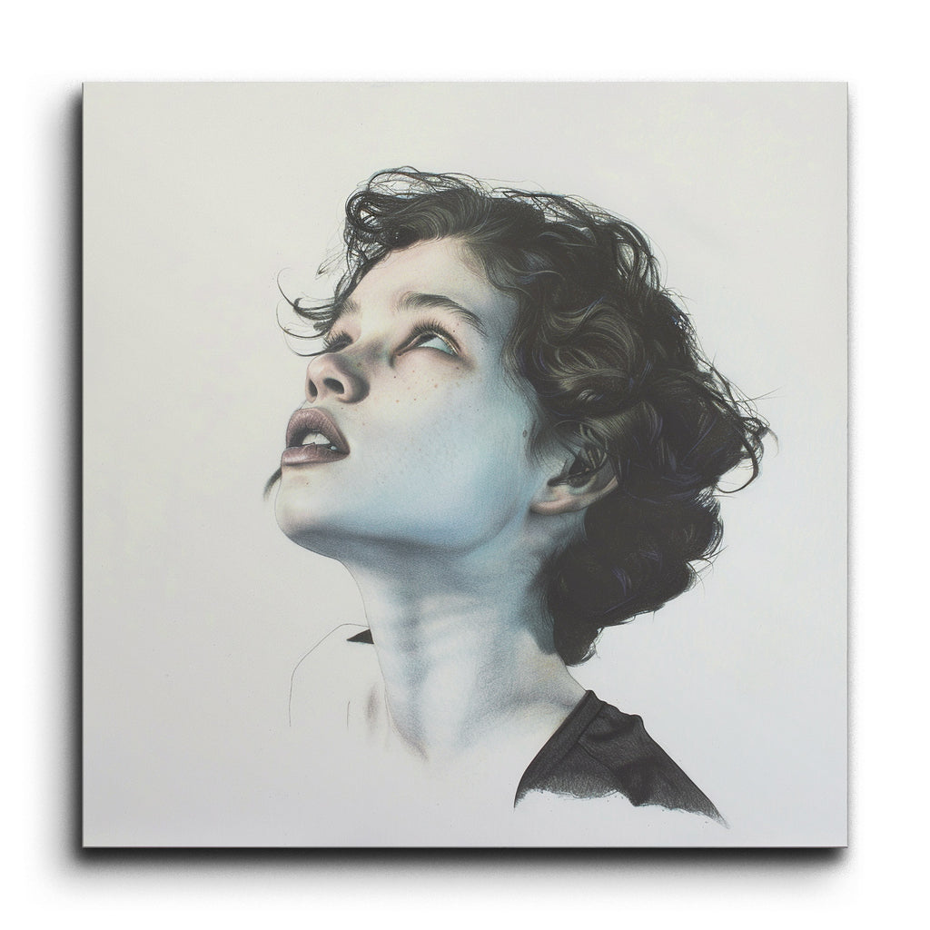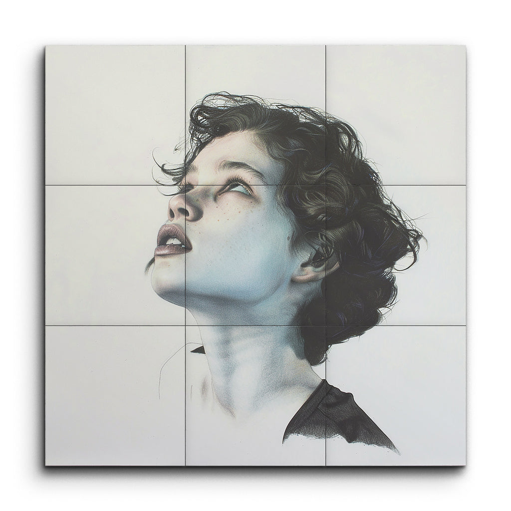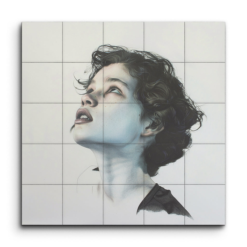Elevate your space with this captivating tile mural, showcasing a hyperrealistic portrait of a young person with short, curly hair. The subject's upward gaze and slightly parted lips evoke a sense of contemplation and hope. Meticulous attention to lighting and shading brings a three-dimensional quality to the soft, natural skin tones and striking, lifelike eyes. The minimalist composition focuses on the face and upper neck, drawing you into the intricate details and emotional depth of the artwork.