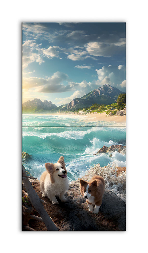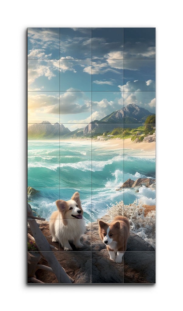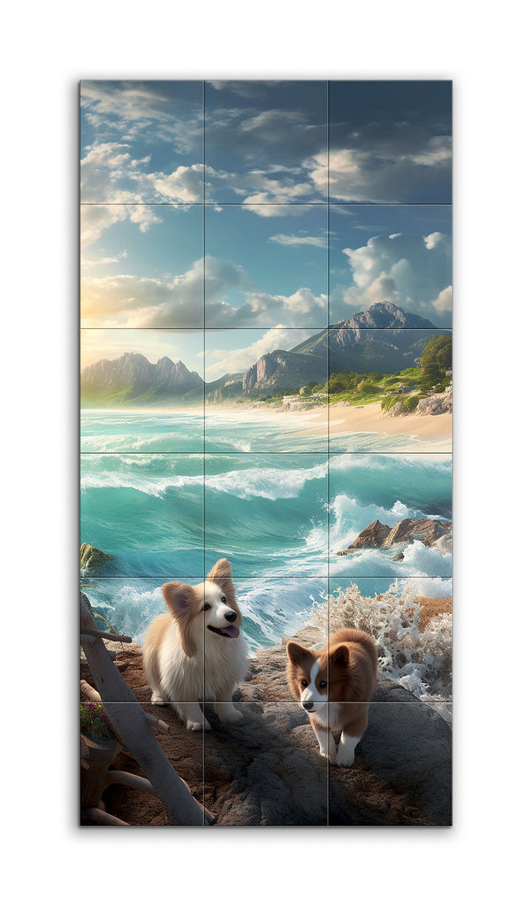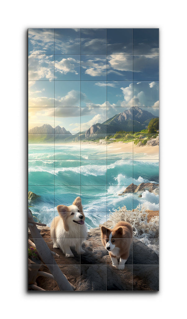 This tile mural captures a picturesque coastal scene featuring two endearing Corgis on a serene beach. Turquoise waves gently crash against a rocky shore as one dog stands, gazing contently into the distance, while the other crouches, seemingly investigating the ground. The backdrop showcases a sandy beach, rocky cliffs, lush greenery, and majestic mountains under a partly cloudy sky. The realistic style and soft lighting create a tranquil and visually captivating composition.