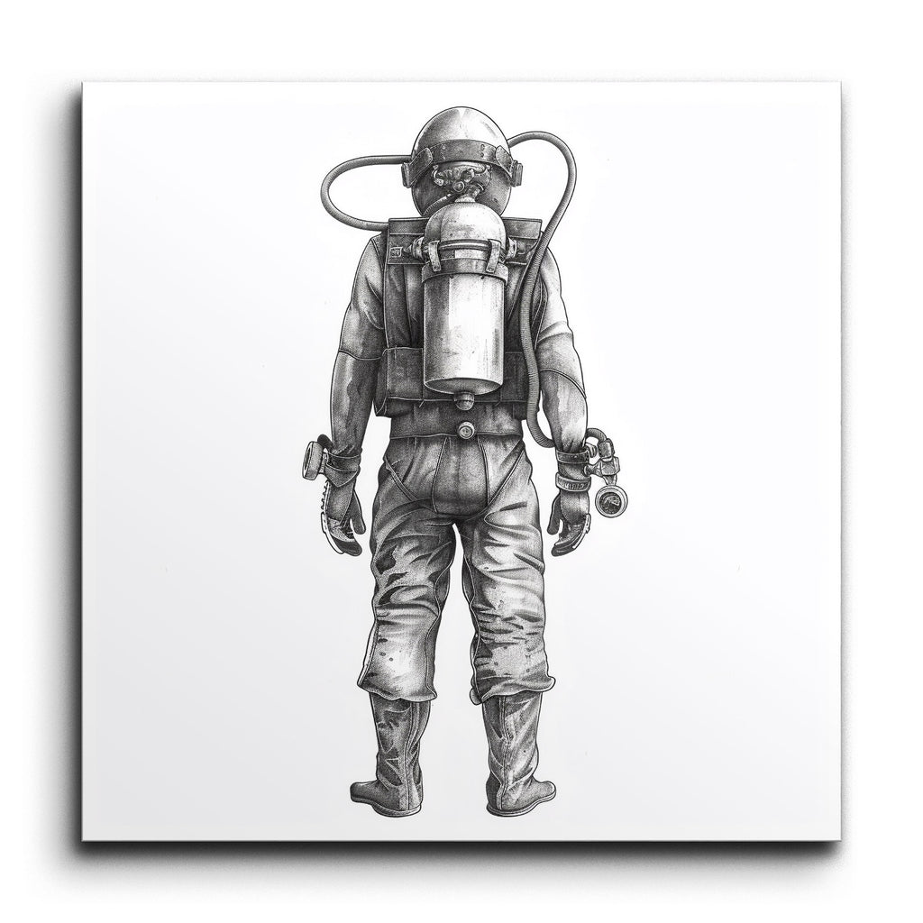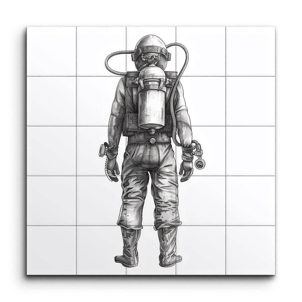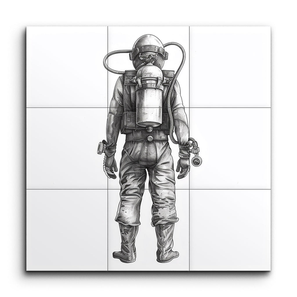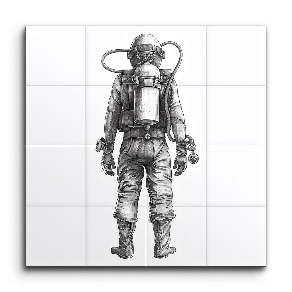 Immerse yourself in the cosmos with this striking tile mural, showcasing a meticulously detailed, monochromatic illustration of an astronaut from behind. The lifelike artwork captures the essence of space exploration, highlighting the intricacies of the astronaut's spacesuit, from the flexible joints to the reinforced boots. The relaxed stance and fine shading bring a sense of realism, while the grayscale palette accentuates the technical marvel of the life-support system. Perfect for any space enthusiast, this mural is a tribute to human ingenuity and the wonders of the universe.