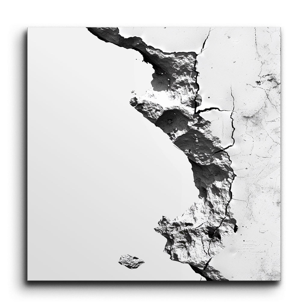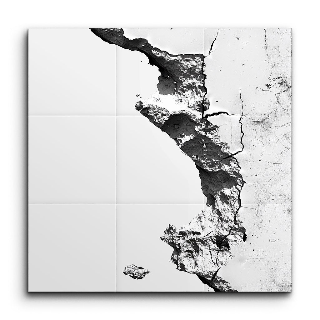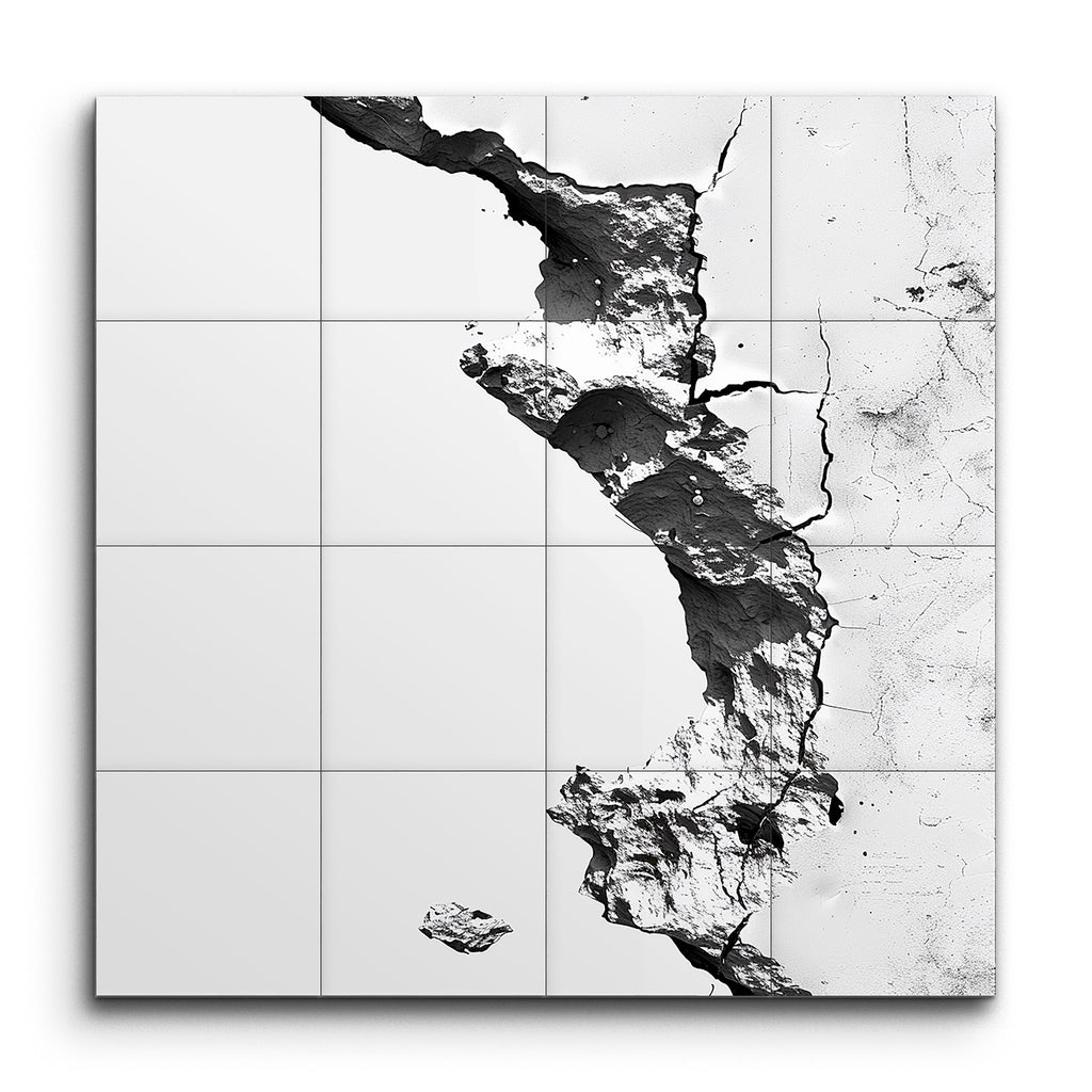 Discover the captivating essence of time and nature with our tile mural, featuring a meticulously detailed depiction of a cracked and eroded surface. This minimalist, abstract artwork showcases a prominent, jagged vertical crack, with intricate fissures branching off, creating a stunning visual narrative of decay and resilience. The grayscale palette enhances the stark contrast between smooth and rough textures, evoking a profound sense of history and the relentless passage of time.