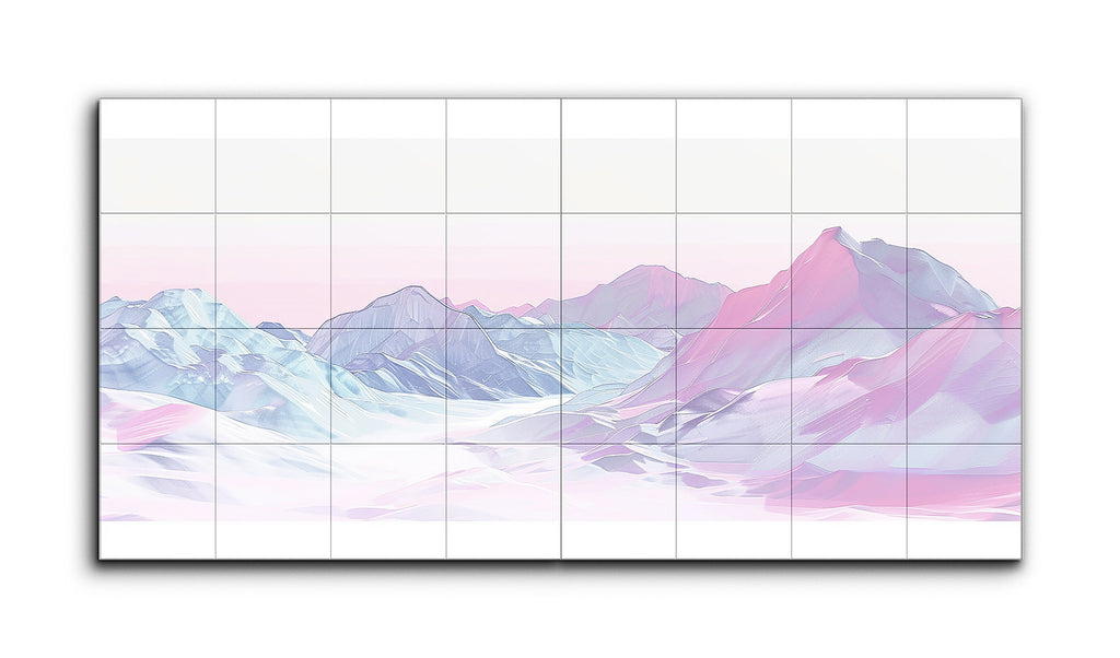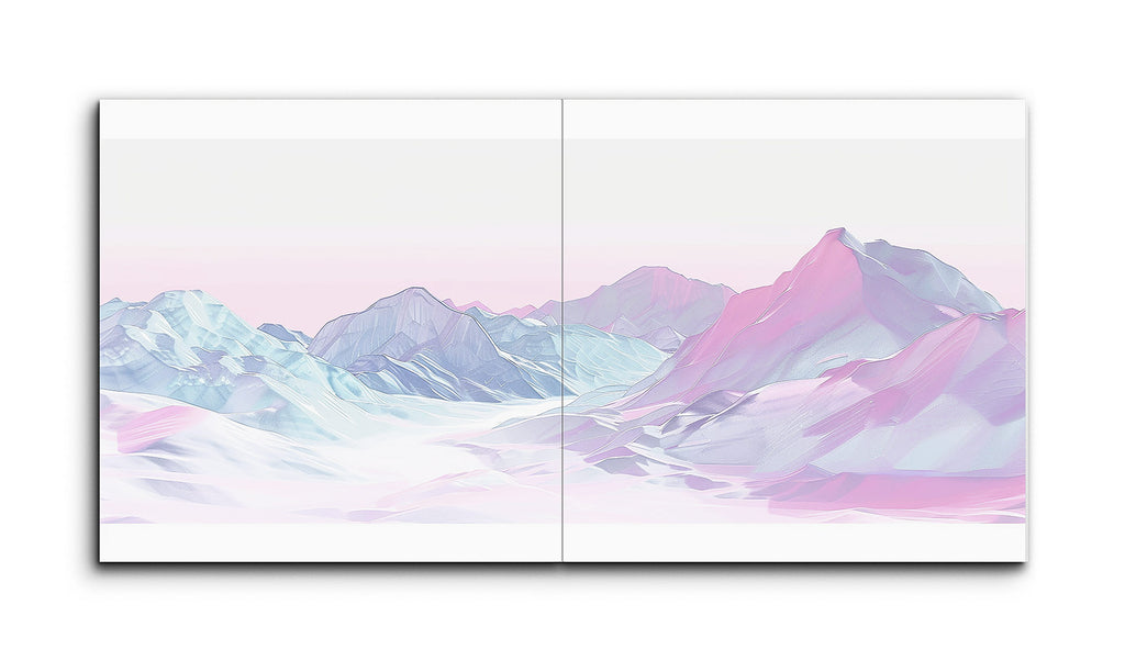 This tile mural is a diptych featuring a stylized, almost abstract mountainous landscape. The modern, minimalist artwork emphasizes form and color, using geometric shapes to give the mountains a crystalline quality. Pastel shades of pink, blue, and purple blend seamlessly, creating depth and a soft, ethereal atmosphere. The digital brushwork enhances the flat, graphic quality, while the balanced composition with rhythmic peaks and valleys invites a serene, contemplative appreciation of this tranquil, imagined landscape.