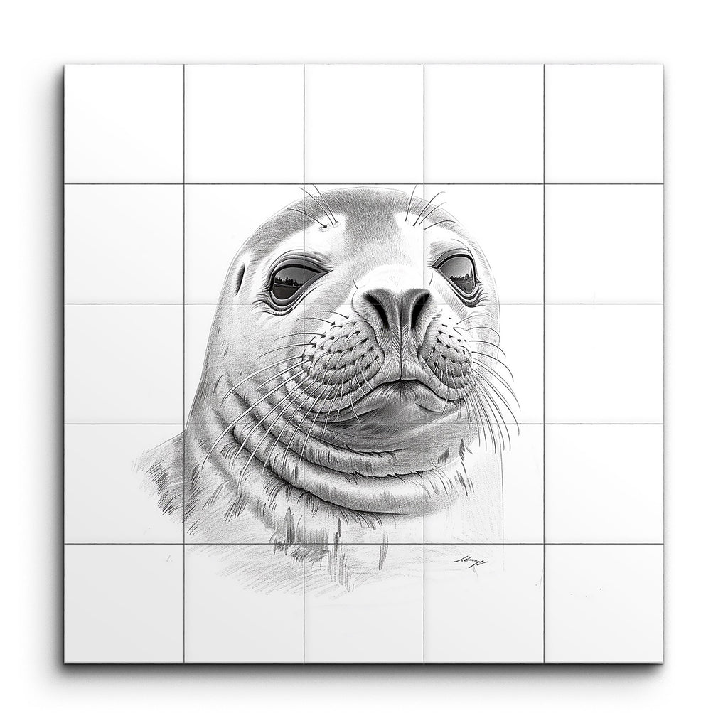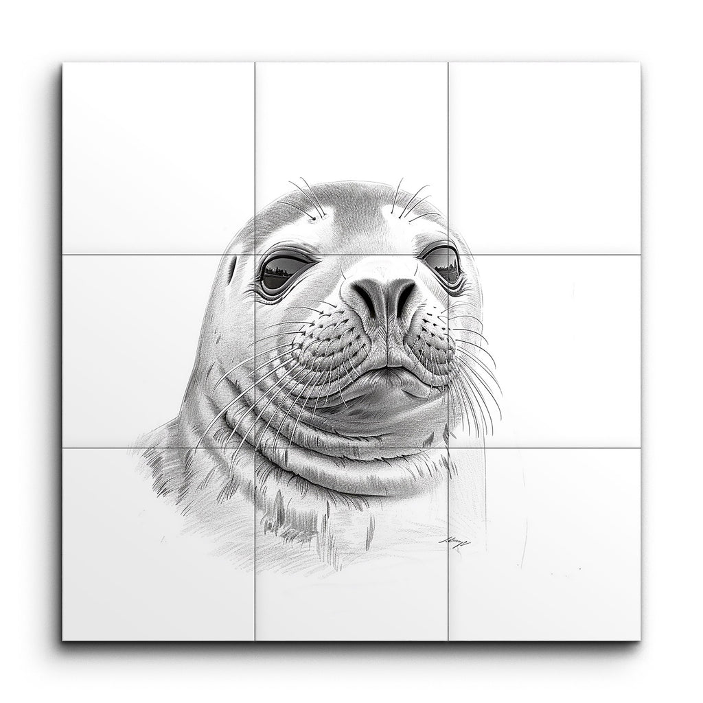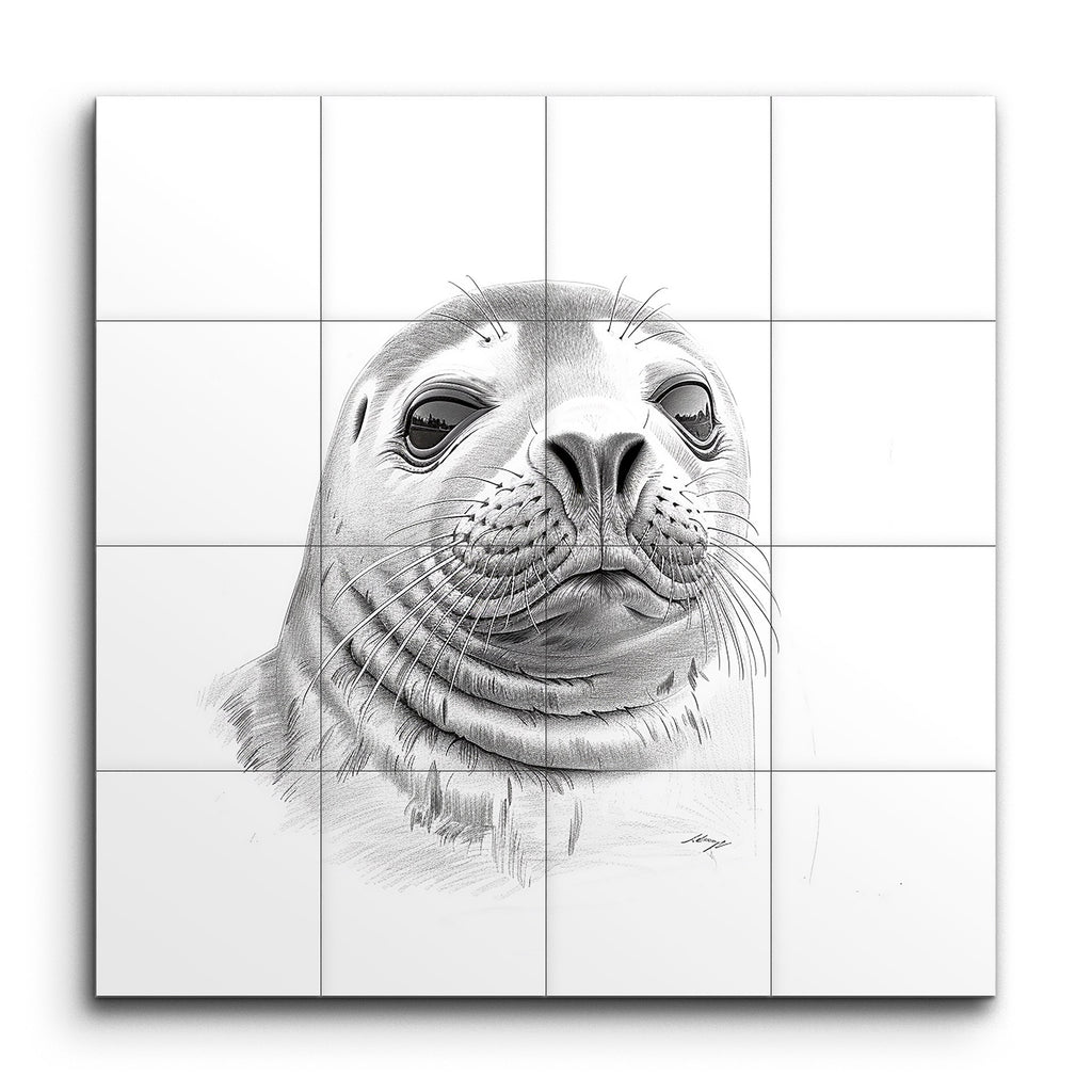 Transform your space with this captivating tile mural featuring a detailed, monochromatic illustration of a seal's face. This artwork masterfully blends pencil and digital techniques to create a highly realistic yet slightly stylized depiction. The meticulous attention to the textures of the seal's fur and whiskers, combined with smooth, gradient shading, lends a three-dimensional appearance. The expressive eyes convey curiosity and intelligence, making this mural a striking focal point for any room.
