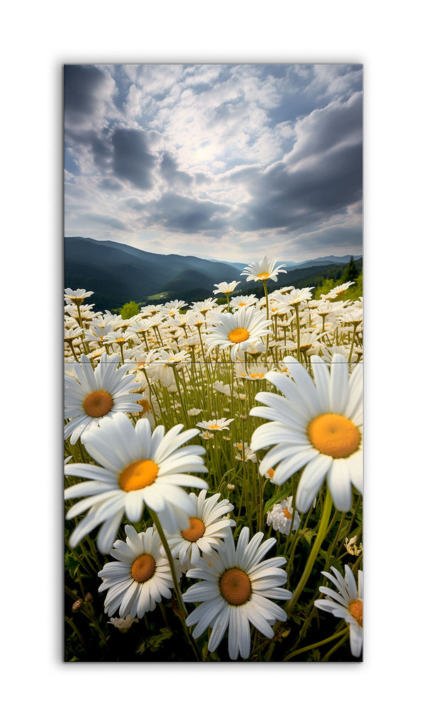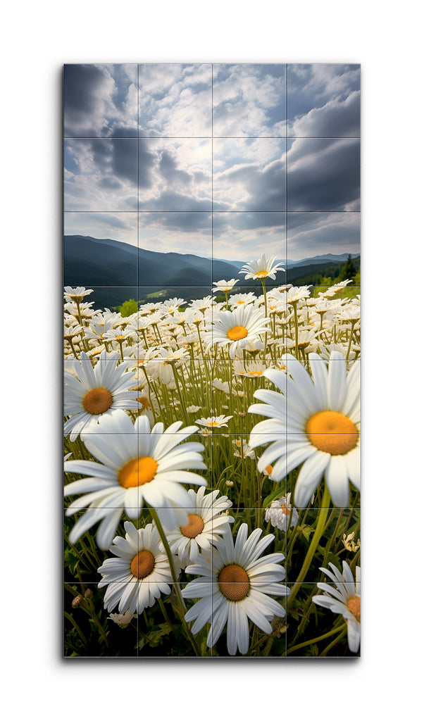 This tile mural features a vibrant and detailed photograph of a field of daisies. The image showcases a multitude of white daisies with bright yellow centers, standing tall amidst green grass. The low perspective makes the foreground daisies appear large and prominent, while the background ones gradually diminish in size, creating depth and vastness. Dramatic, billowing clouds partially obscure the sunlight, casting a soft, diffused light that enhances the natural colors. In the distance, rolling hills or mountains add to the sense of scale and beauty. The realistic and highly detailed style captures the scene with clarity and precision, making the viewer feel as if they are standing in the field themselves.