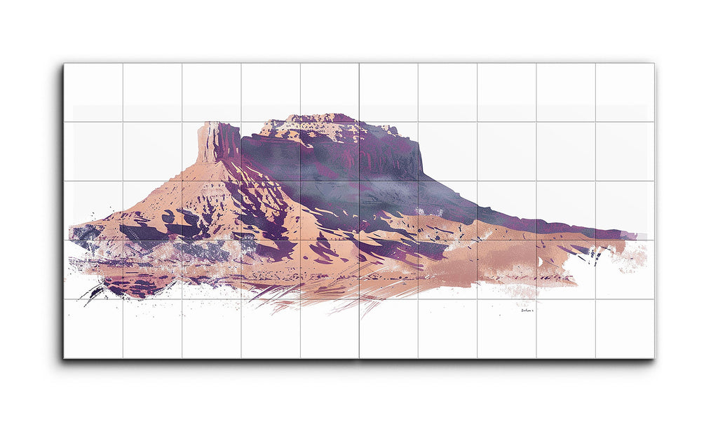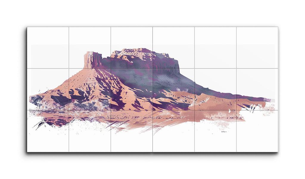 This tile mural features a modern, abstract landscape, possibly depicting a desert mesa or butte, split across two panels in a diptych format. Dominated by shades of pink, purple, and brown, the color palette lends a warm, otherworldly feel. The piece combines broad, sweeping brushstrokes with finer details, creating a sense of movement and texture. Geometric shapes and expressive strokes suggest the landscape's contours and elements, evoking a tranquil, minimalist aesthetic without literal depiction.