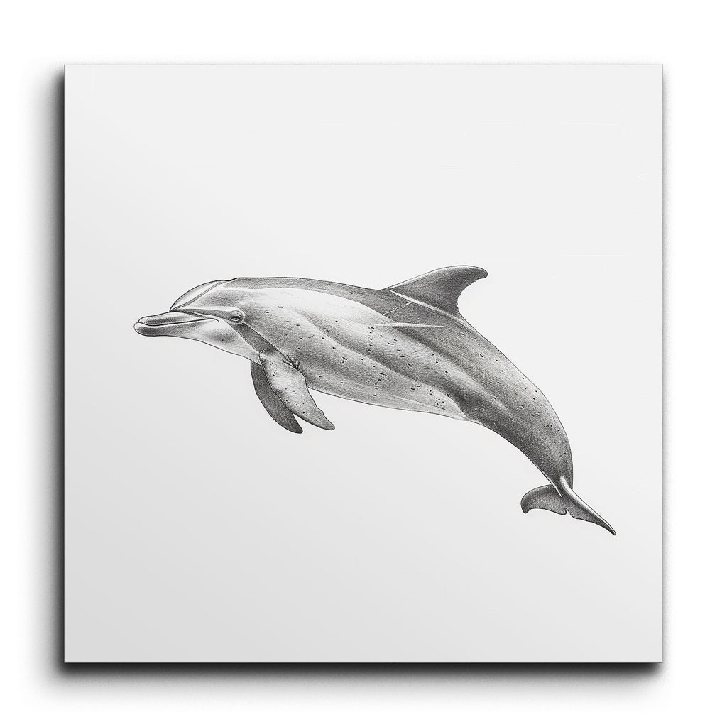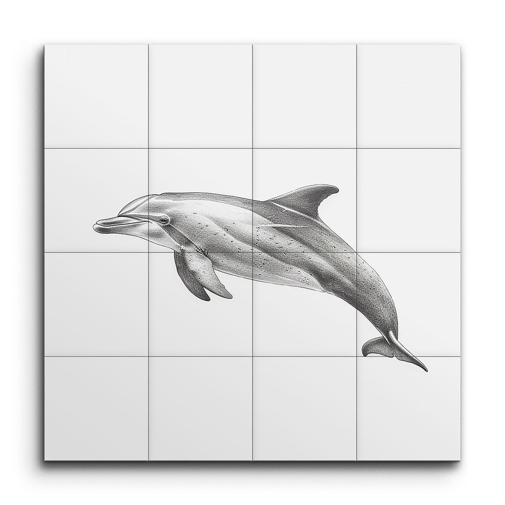 Immerse yourself in the elegance of marine life with this captivating tile mural, showcasing a highly realistic illustration of a dolphin. The artist's meticulous attention to anatomical detail and masterful use of shading create a stunning three-dimensional effect. The dolphin, rendered in a dynamic swimming pose with a monochromatic palette, exudes grace and fluidity. This artwork beautifully captures the dolphin's natural elegance, making it a striking centerpiece for any space.