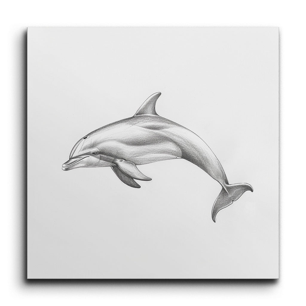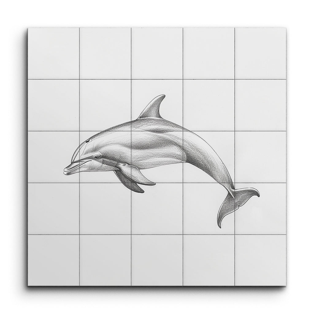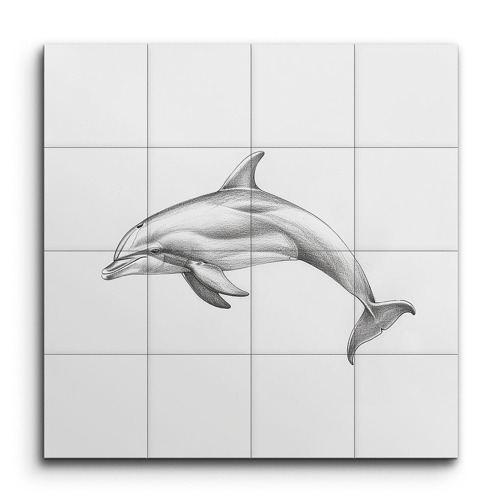 Dive into the mesmerizing beauty of marine life with this stunning tile mural featuring an intricately detailed dolphin. Captured in a dynamic, lifelike pose, the dolphin appears to swim gracefully across the surface. The artist's masterful use of fine lines, cross-hatching, and stippling techniques brings out the texture of the dolphin's skin and the play of light and shadow, creating a captivating three-dimensional effect. The monochromatic tones further enhance the depth and realism, making this mural a striking centerpiece for any space.