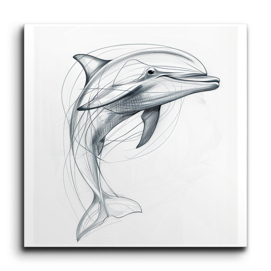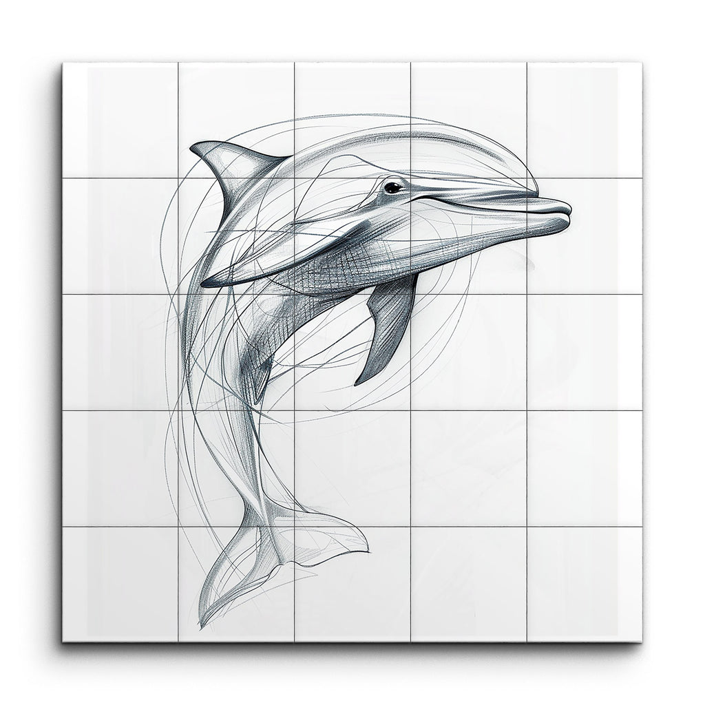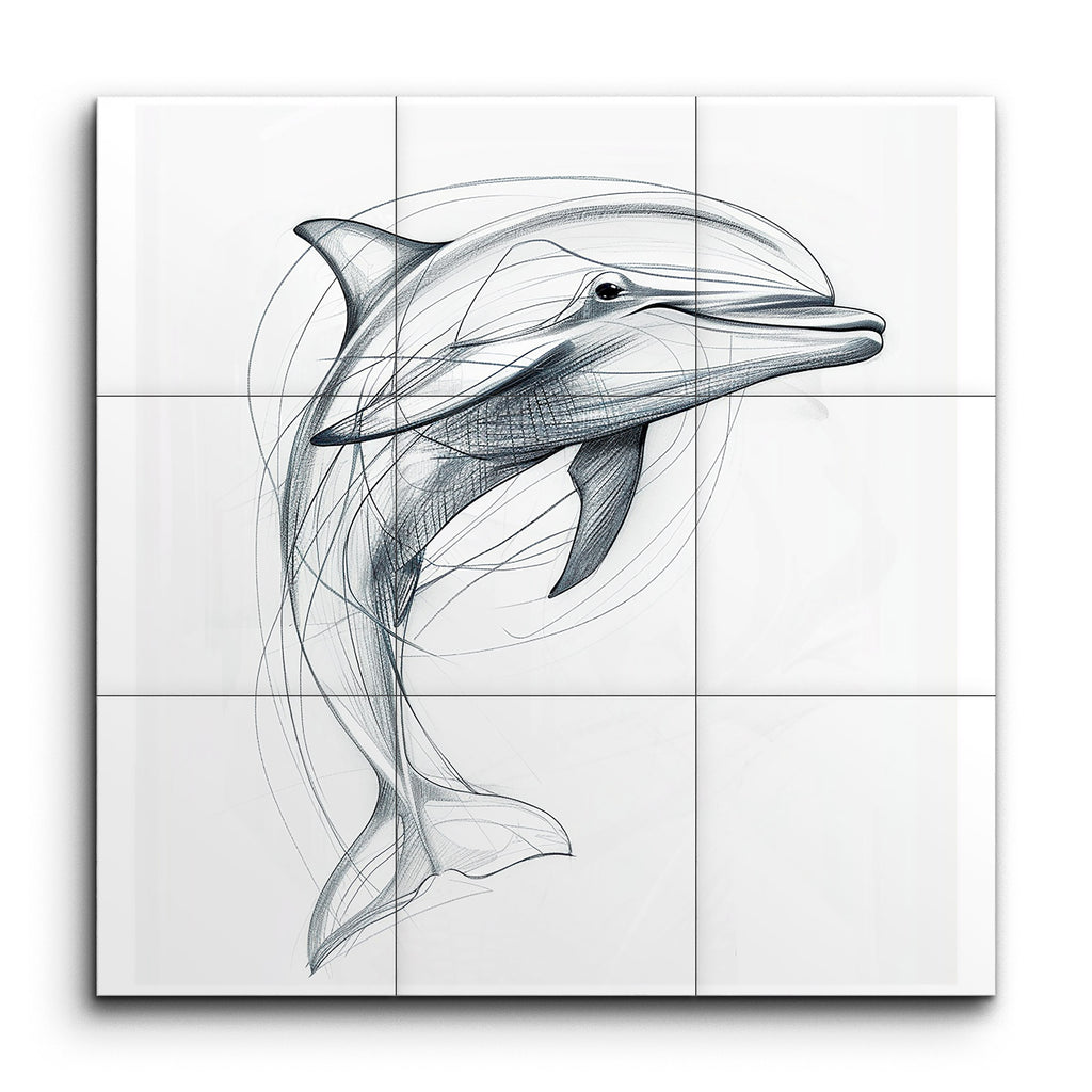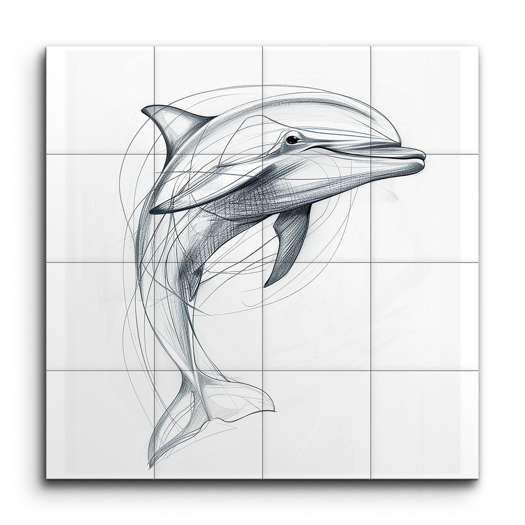 Dive into elegance with our tile mural featuring a minimalist dolphin artwork. The piece captures the dolphin's natural grace through fine, flowing lines that convey motion and fluidity. Varying line thickness adds depth, while subtle shading through line density enhances its sophisticated feel. The airy, dynamic composition intertwines lines to suggest form and movement, creating a polished yet sketch-like masterpiece that brings a touch of refined aquatic beauty to any space.