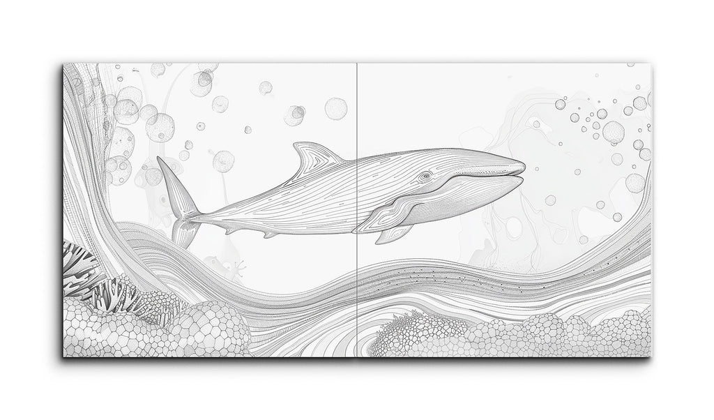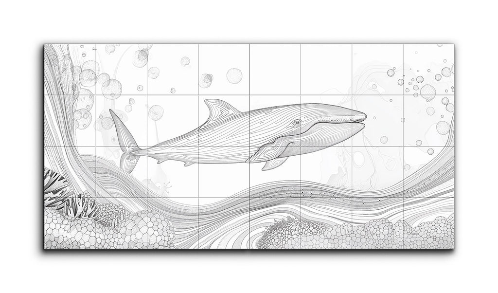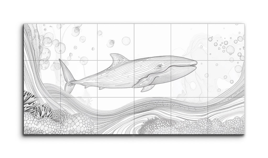 This two-panel tile mural showcases a detailed line drawing of a dolphin in side profile, swimming gracefully through water. The dolphin's streamlined body, from its beak-like snout to its flukes, is intricately rendered with subtle gradations and textures. Surrounding wavy lines evoke water movement, while bubbles of various sizes enhance the underwater feel. The lower part features stylized seabed patterns resembling coral or aquatic plants, adding depth. The monochromatic line art emphasizes form and movement through meticulous, patient drawing.
