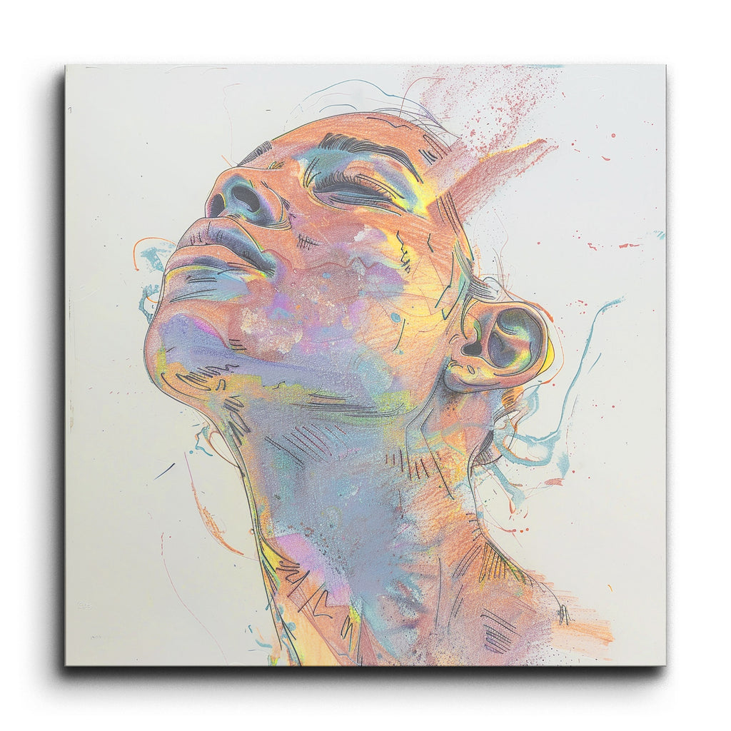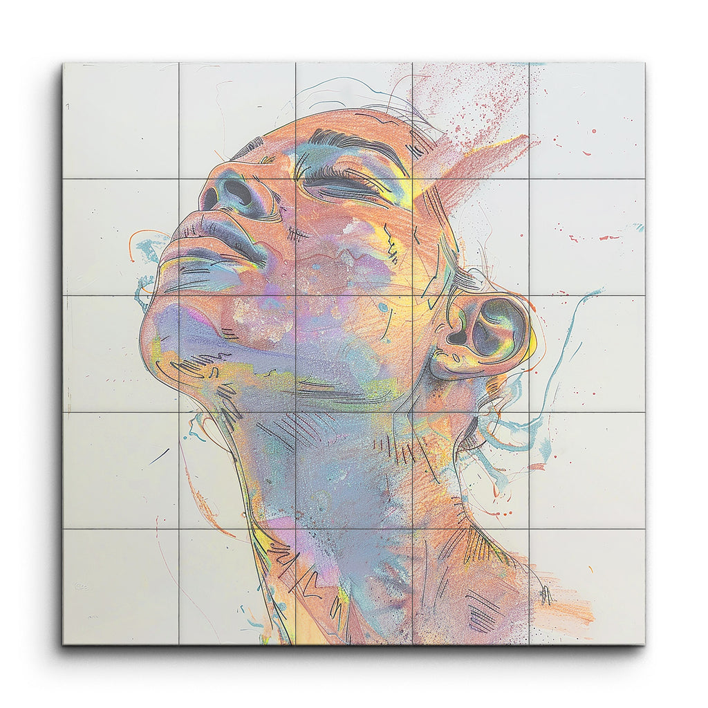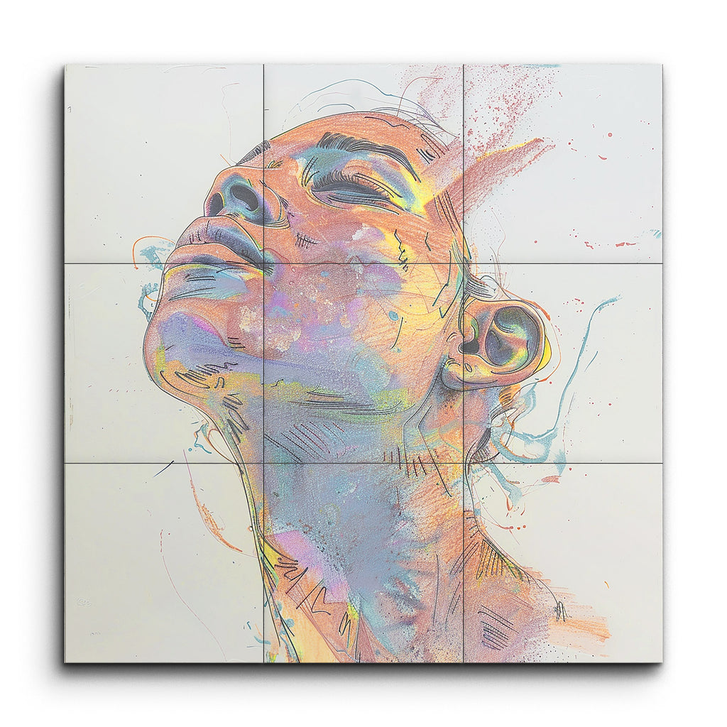 This captivating tile mural showcases a deeply expressive portrait, blending realism with abstract artistry. The serene face, tilted upwards, is rendered with intricate lines and soft transitions that create a dynamic interplay of sharp details and smooth areas. Vibrant pastel hues of pink, blue, yellow, and purple evoke light and shadow, giving the portrait a three-dimensional presence. Abstract splashes and strokes extend beyond the face, adding movement and a dreamlike quality, making this piece both visually and emotionally compelling.