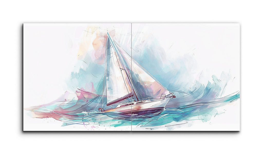 This tile mural features a modern, abstract depiction of a sailboat in motion. The sailboat, with its well-defined hull and wind-filled sails, captures a sense of movement and energy. Expressive brushstrokes represent the waves, using a soft palette of pastel blues, pinks, and purples to create a dreamy seascape. The background blends warm and cool tones, suggesting a serene sky at dawn or dusk. The piece conveys freedom and tranquility, with a contemporary, impressionistic style that emphasizes emotion and atmosphere.
