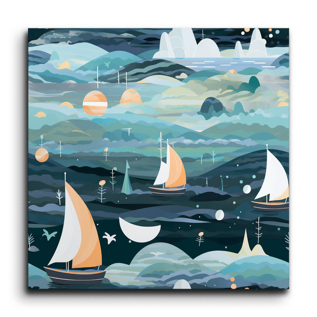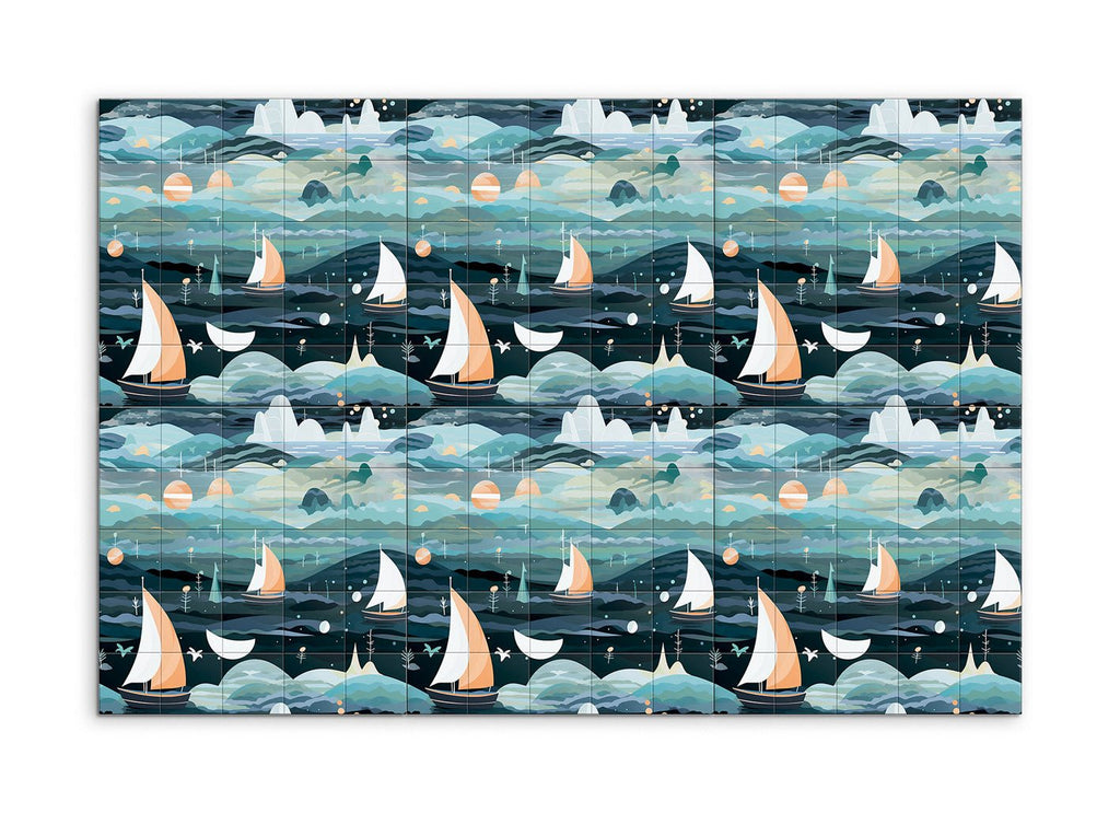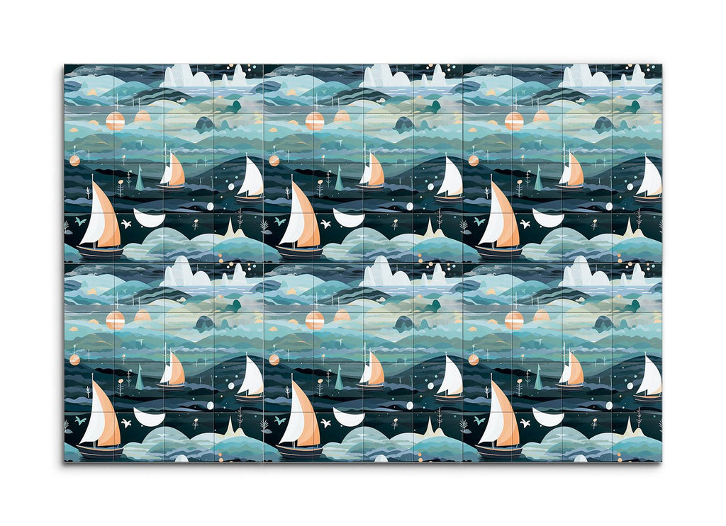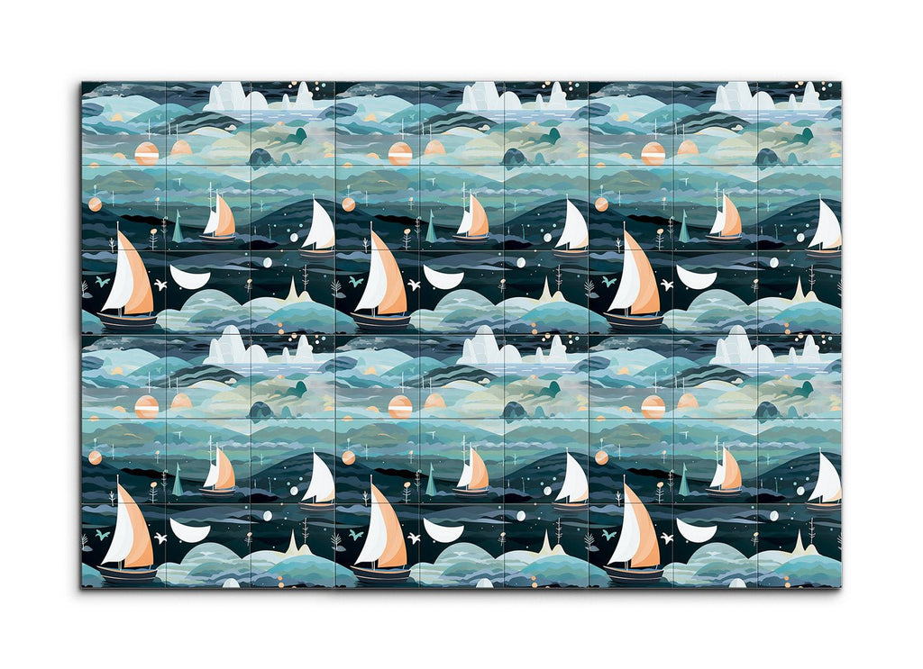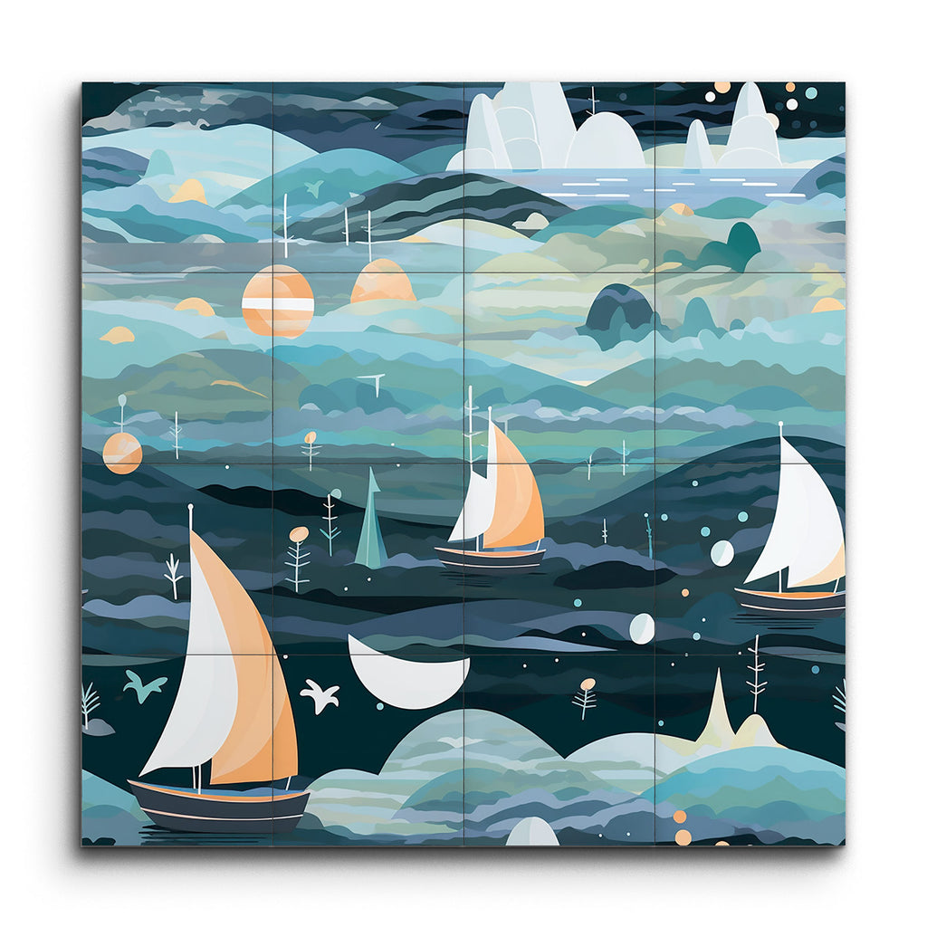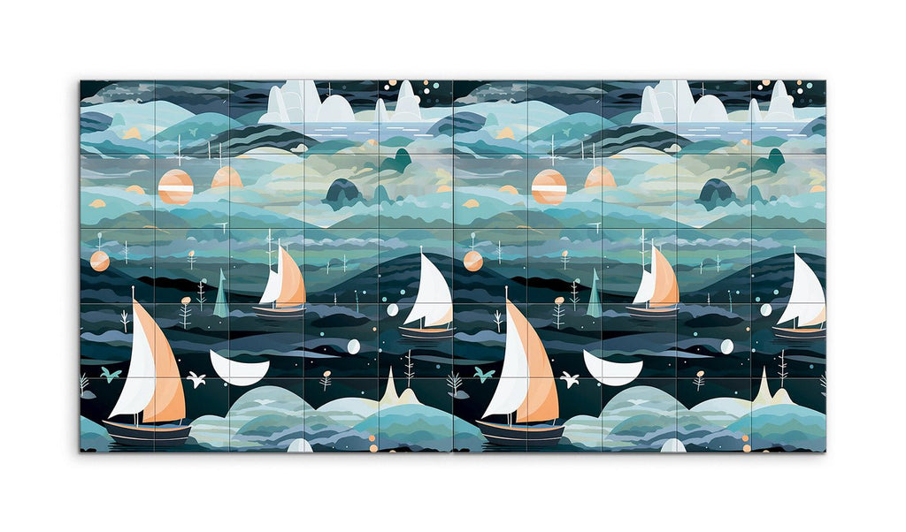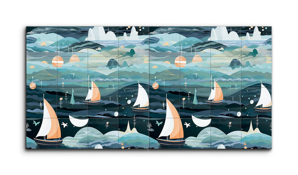 Transform your space with this captivating tile mural, showcasing a serene and whimsical seascape where sailboats navigate through a dreamy, layered ocean. The predominantly cool tones of blue and teal are beautifully contrasted by soft pastel hues of orange and white, making the sailboats pop against the undulating waves. Abstract geometric shapes and circular forms float in the sky and water, adding depth and a surreal touch. The fluid, modern design and harmonious color scheme create a tranquil, otherworldly atmosphere.