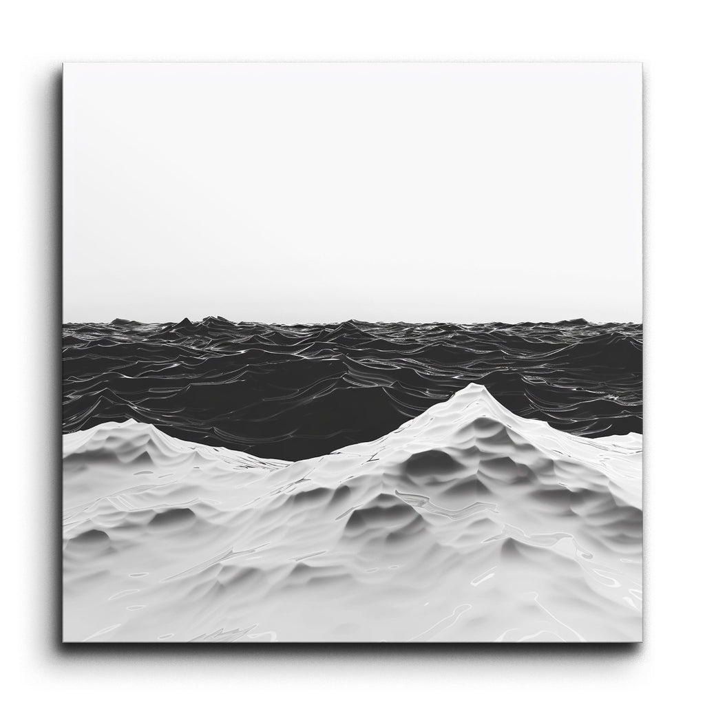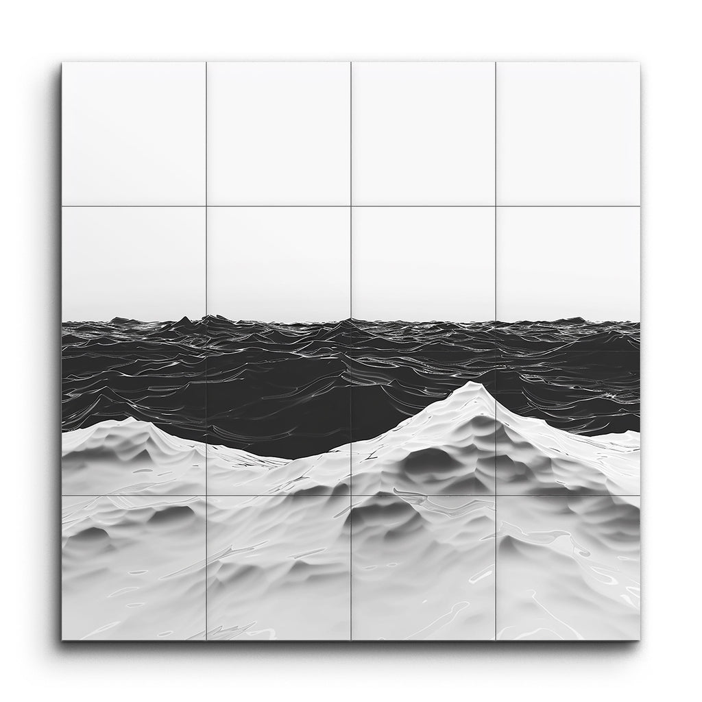 Dive into the dual essence of the ocean with this captivating tile mural. The minimalist design divides the scene into two sections: a serene, smooth gradient of undulating waves in lighter tones below, transitioning to a darker, more turbulent sea above. The monochromatic black and white palette enhances the contrast between calm and stormy waters, creating a striking visual impact. This modern, abstract artwork captures the ocean's serene beauty and dramatic intensity, making it a compelling focal point for any space.