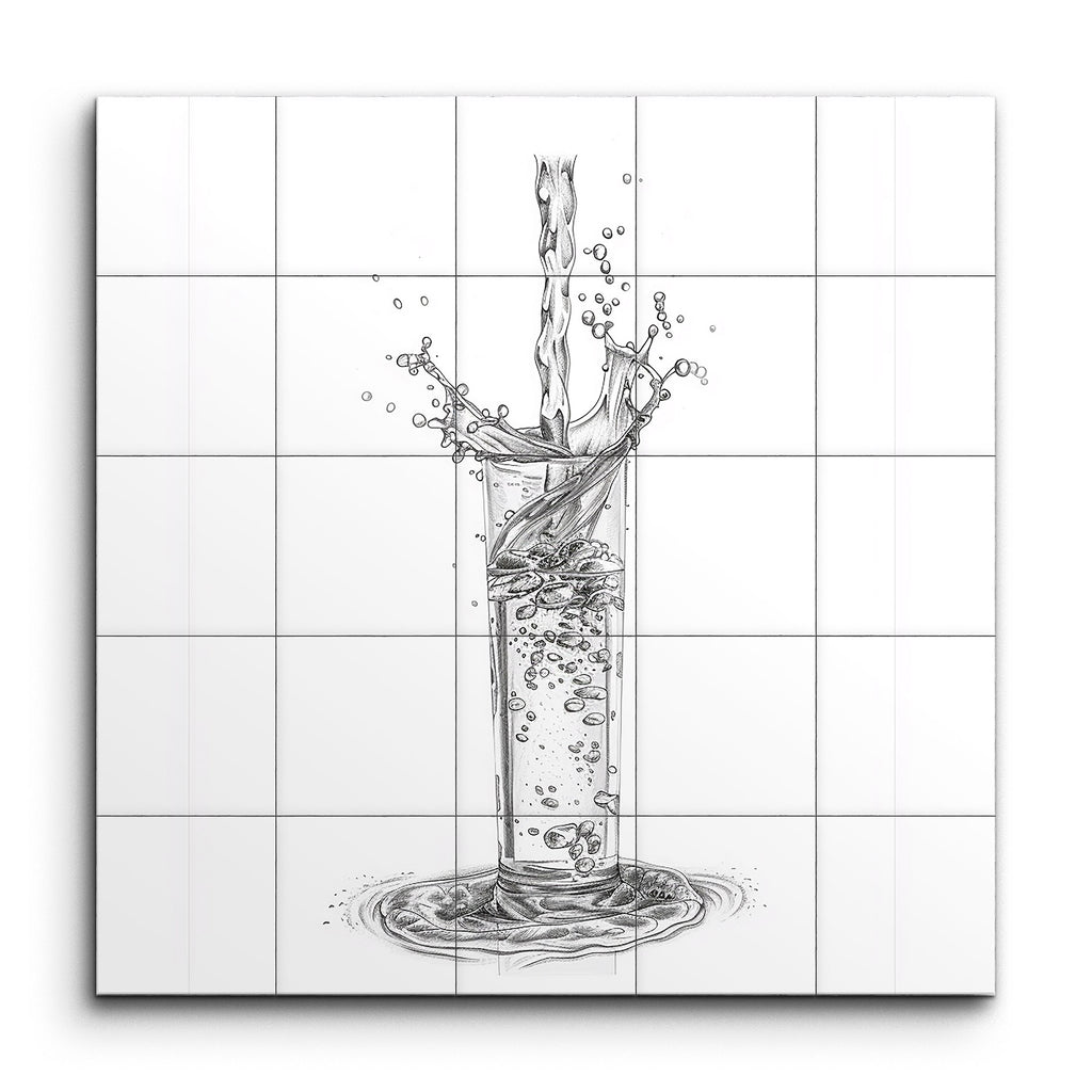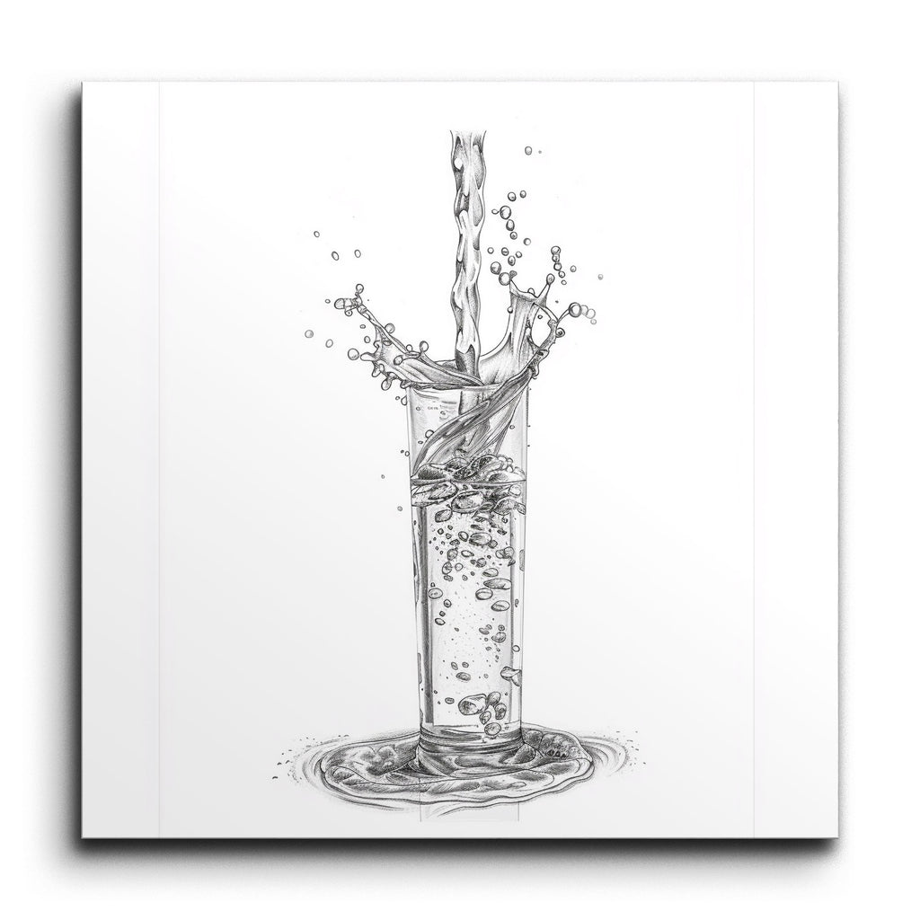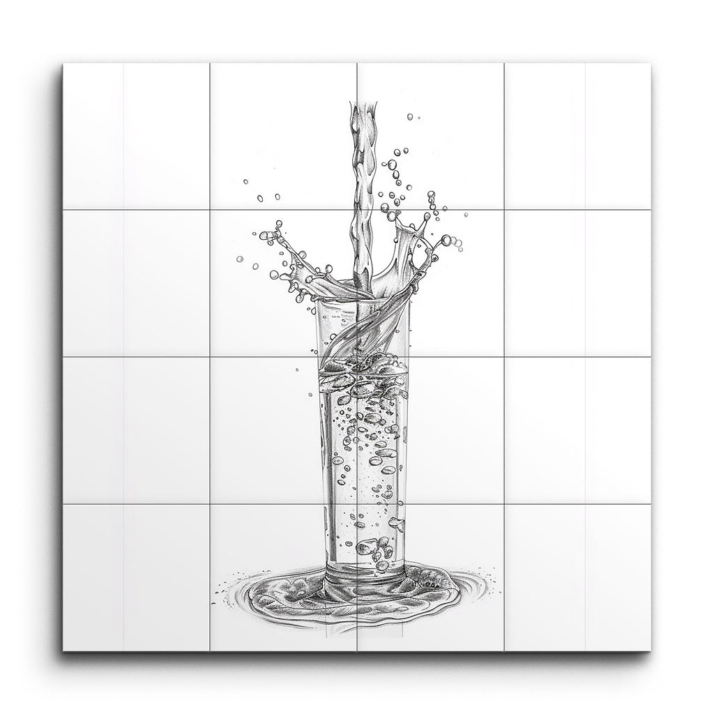 Transform your space with this captivating tile mural, featuring a masterfully detailed monochromatic illustration of a tall glass mid-pour. The dynamic splashes and bubbles bring an energetic sense of movement, while the intricate lines and shading offer a strikingly realistic texture. This piece blends realism with technical precision, capturing the fluidity and transparency of water along with the reflective properties of glass. Elevate any setting with this visually stunning depiction of a simple, everyday moment.
