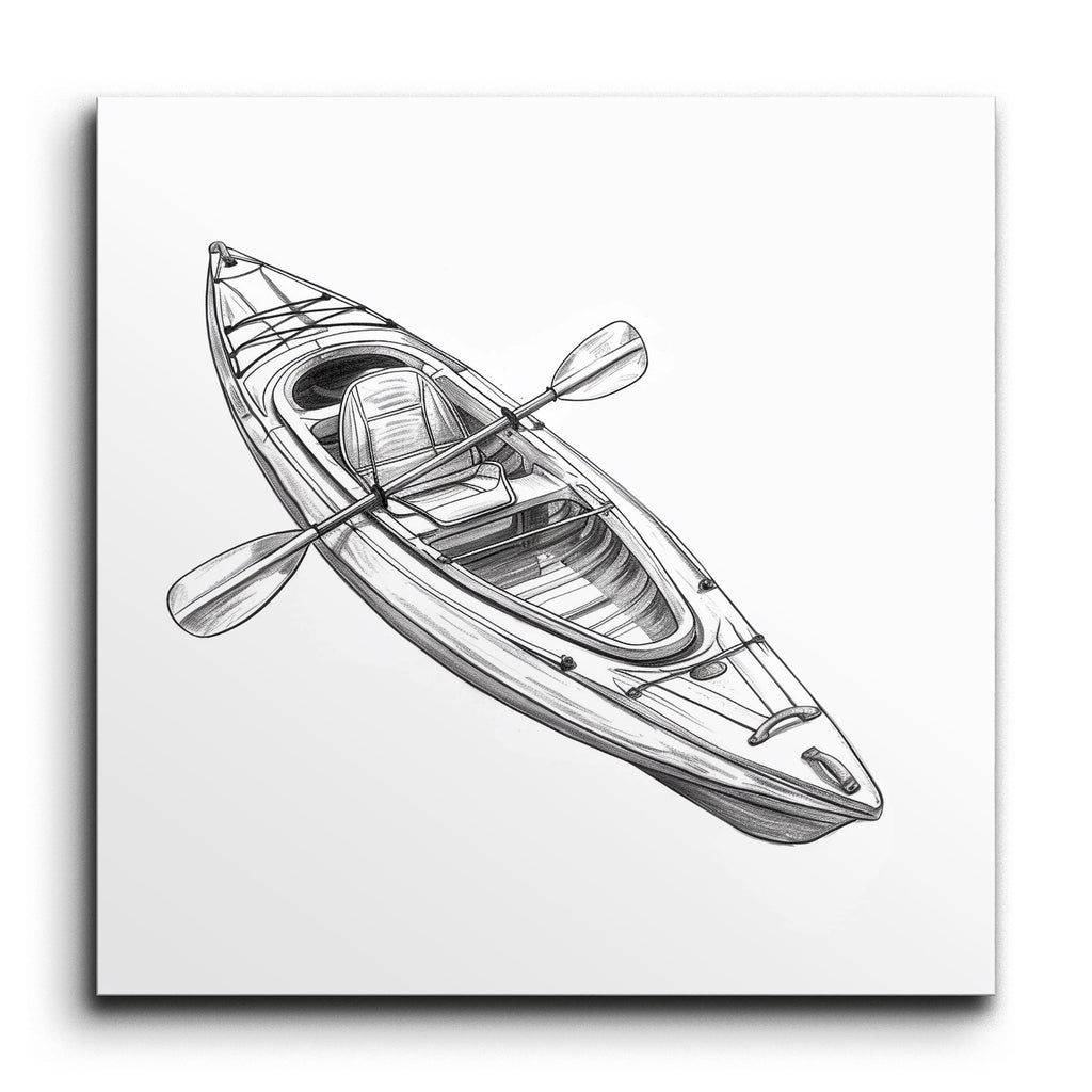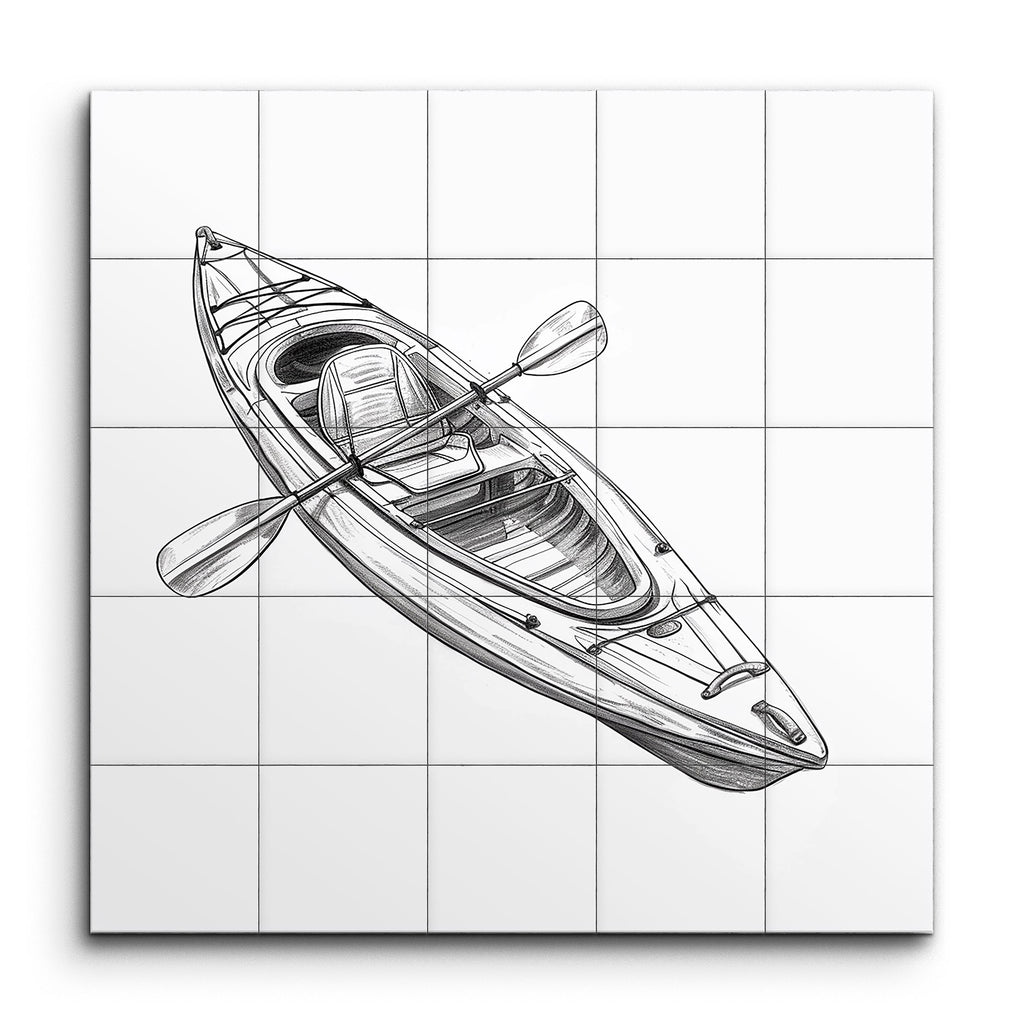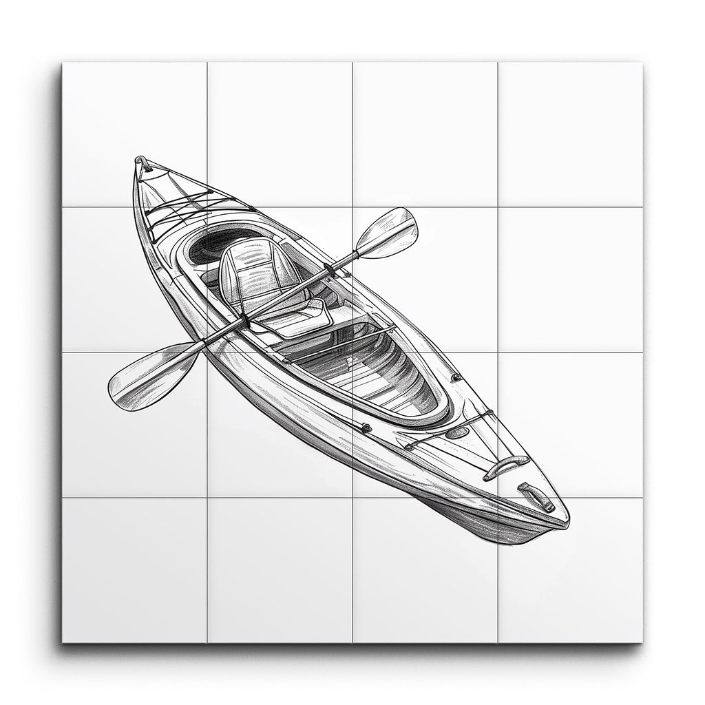 Immerse yourself in the world of adventure with our striking tile mural, featuring a meticulously detailed line drawing of a kayak. This highly illustrative piece showcases fine lines and cross-hatching techniques to bring depth and texture, presenting the kayak in a dynamic three-quarter view. With clean, precise lines highlighting the seat, paddle, and compartments, this monochromatic artwork emphasizes craftsmanship and technical accuracy, making it a captivating focal point for any space.