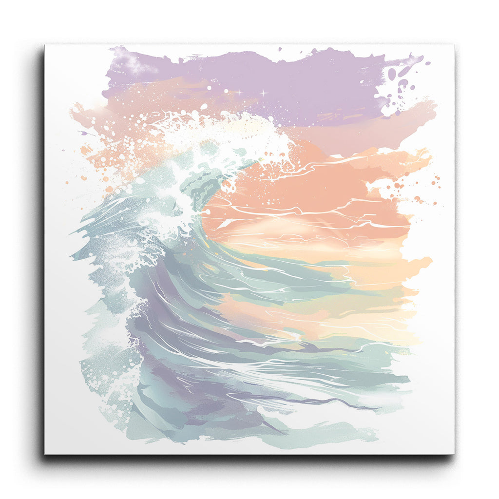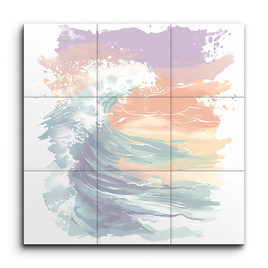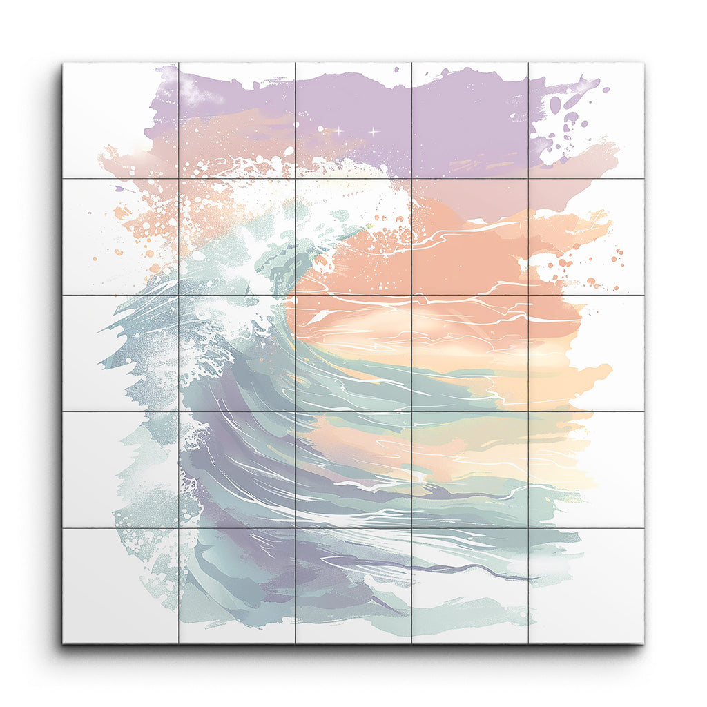 Immerse your space in the captivating energy of the ocean with this stunning tile mural. The artwork portrays a dynamic wave in a stylized, abstract fashion, using rich shades of blue, teal, and white to convey depth and motion. Frothy splashes at the crest emphasize the wave's power, while a serene gradient of pastel peach, pink, and lavender in the background adds a calming contrast. Loose brushwork and impressionistic elements create a harmonious balance, making this piece both visually engaging and evocative.
