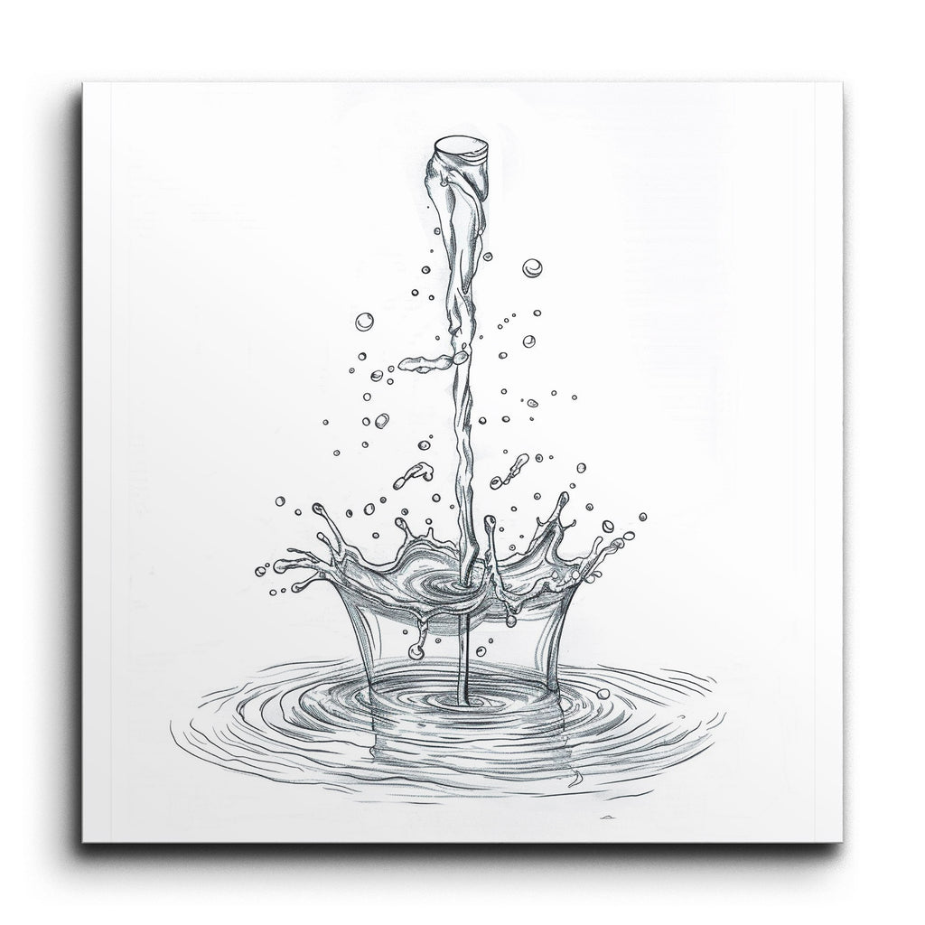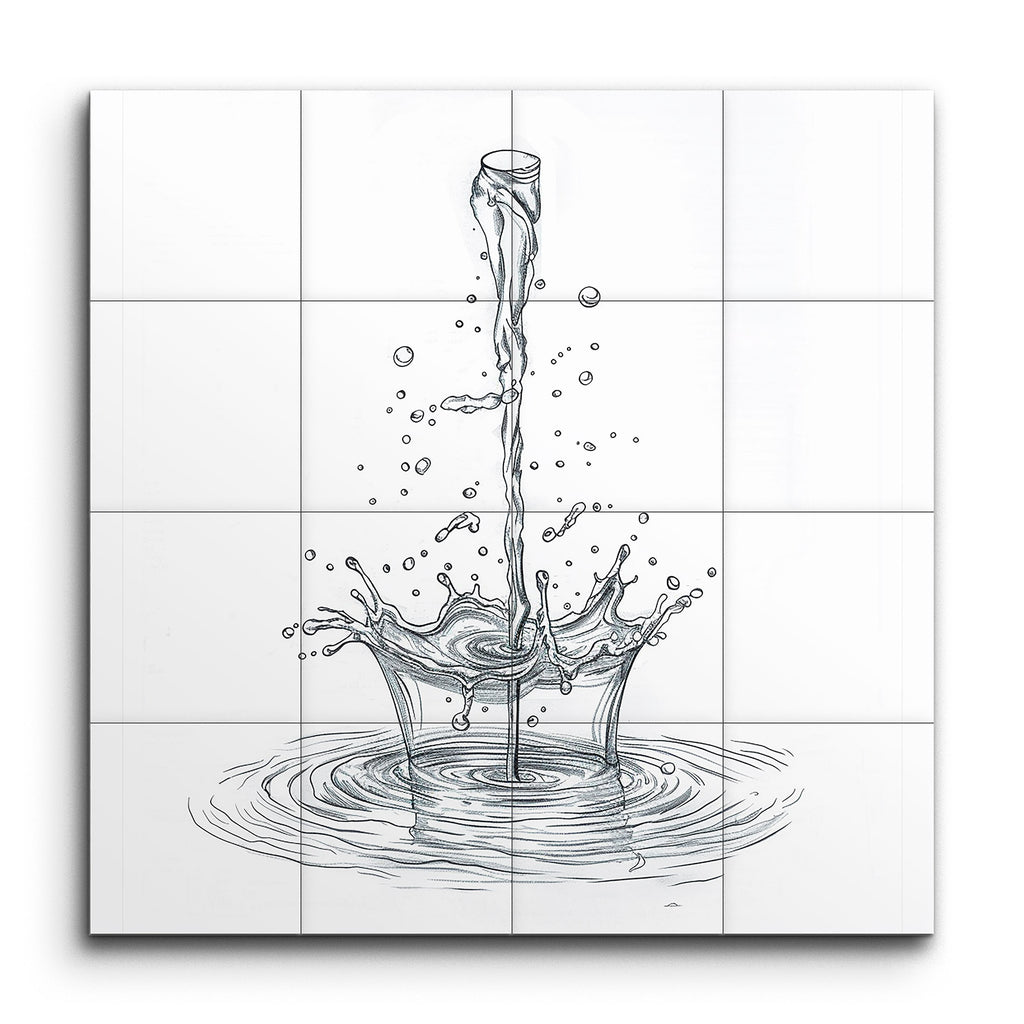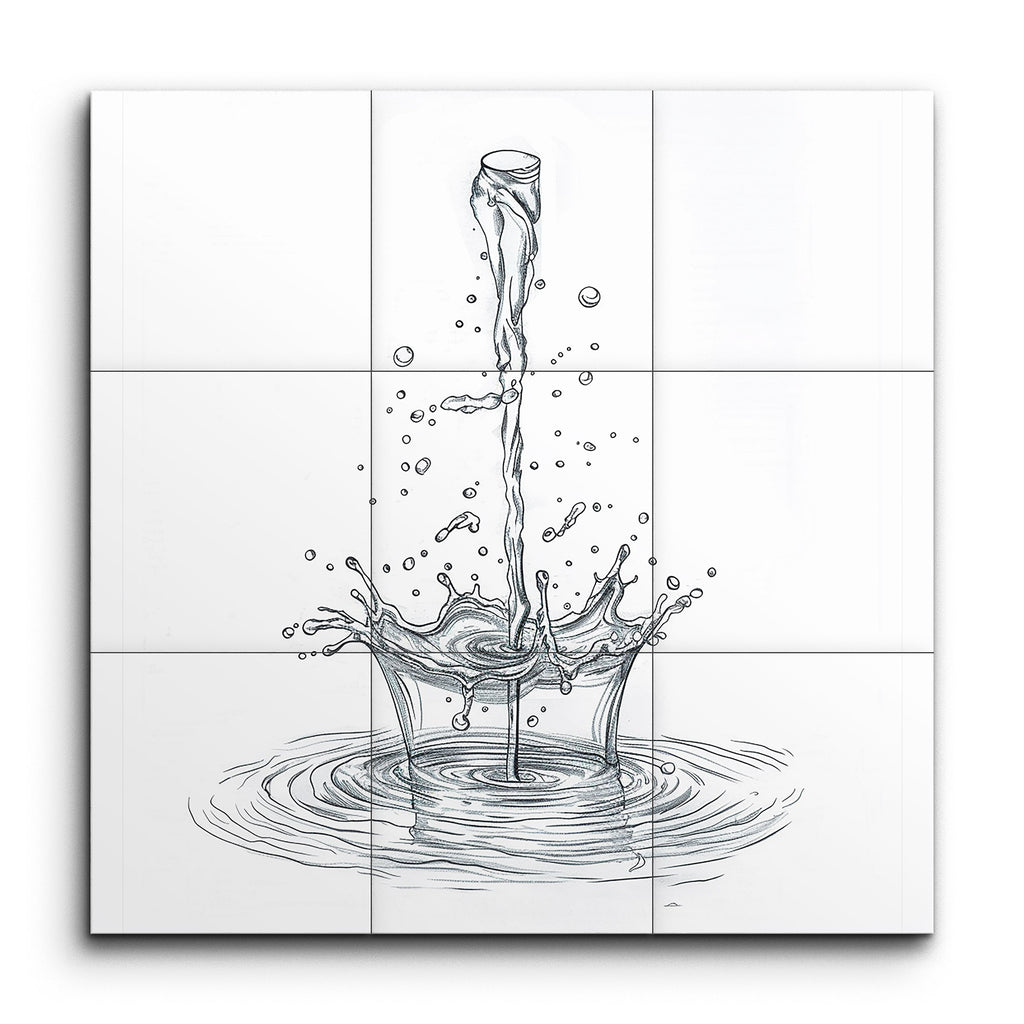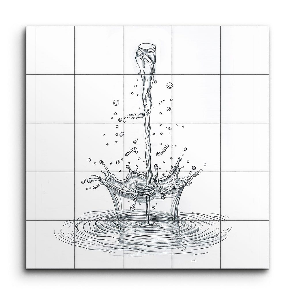 Immerse your space in the captivating motion of water with our stunning tile mural. This artwork showcases a dynamic sketch of a water splash, capturing the moment a stream hits the surface. Fine lines and precise shading bring to life the fluidity and motion, with droplets suspended mid-air and ripples spreading outward. The minimalist style and balanced composition focus your attention on the intricate details, making the scene appear three-dimensional and lifelike. Perfect for adding a touch of elegance and dynamism to any room.