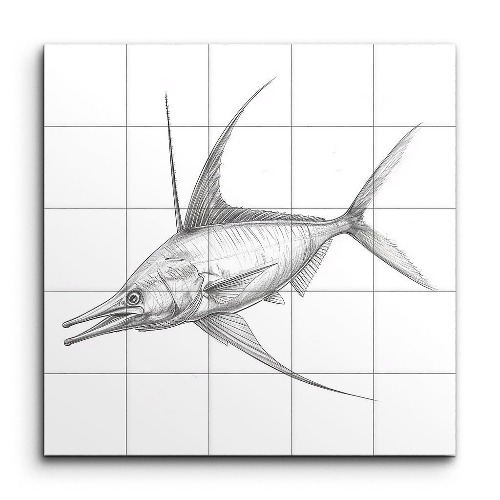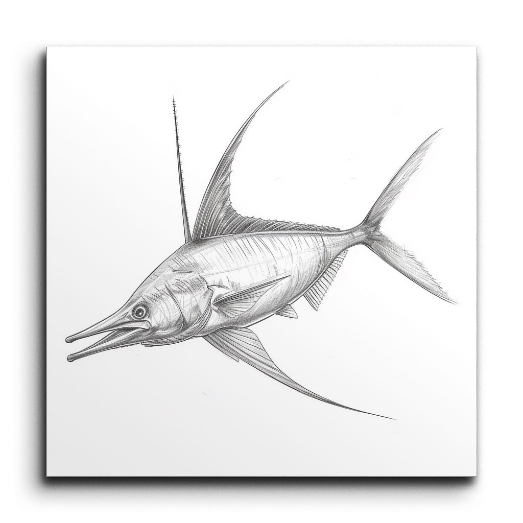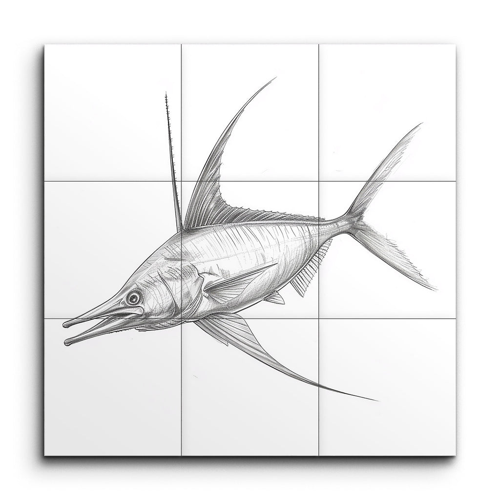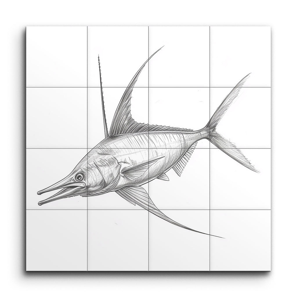 Transform your space with this captivating tile mural featuring a meticulously detailed pencil sketch of a swordfish. Captured in a dynamic swimming pose, the swordfish's elongated bill, sleek body, and intricately drawn fins exude speed and agility. The realistic shading and fine lines bring the fish to life, creating a stunning three-dimensional effect. This artwork is perfect for adding a touch of oceanic elegance and natural beauty to any room.