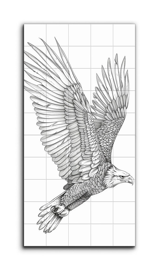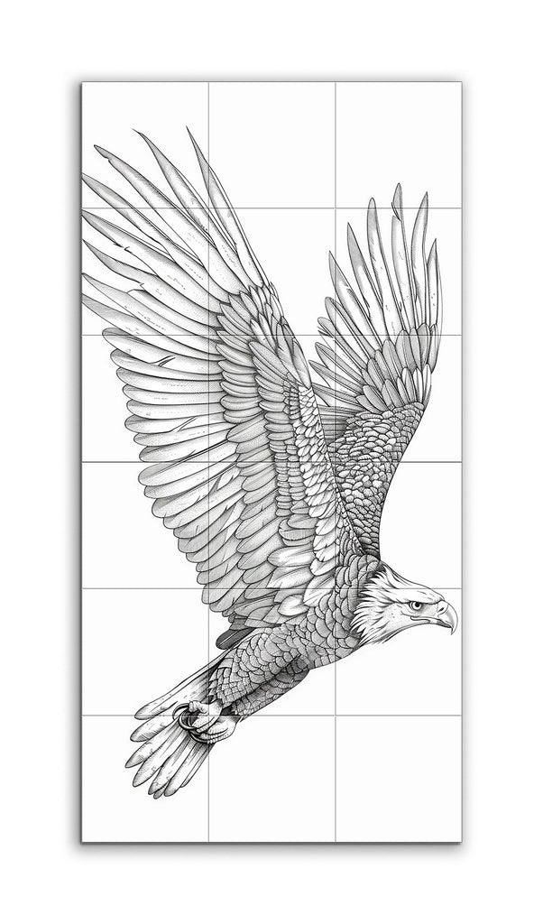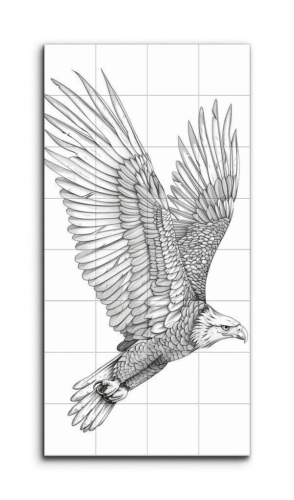 This tile mural showcases a highly detailed and realistic illustration of an eagle in flight. The eagle’s wings are fully extended, capturing its dynamic movement and grace. Each feather is meticulously drawn, showing texture and layering with fine lines that add depth and a three-dimensional quality. The eagle’s head is turned slightly, with a fierce and focused expression, emphasizing its predatory nature. The monochromatic color scheme, using shades of black and white, enhances the dramatic and striking appearance of the piece.
