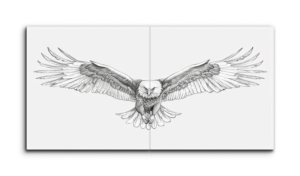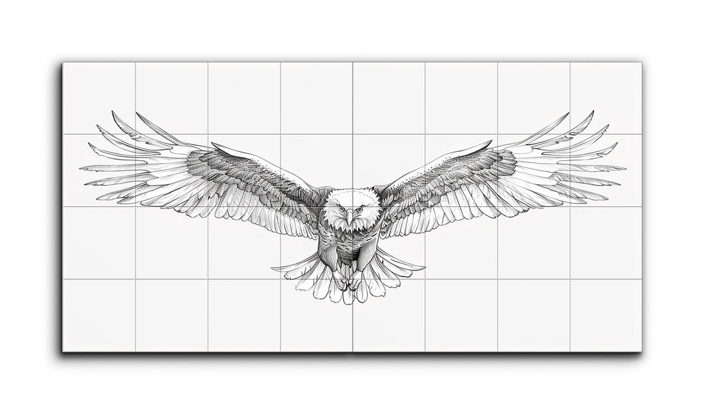 This tile mural showcases a highly detailed and realistic illustration of an eagle in mid-flight. The artwork captures the eagle with wings fully extended, exuding motion and power. Meticulous lines portray the texture and layering of the feathers, with an impressive wingspan stretching across the entire piece. The eagle's head is turned slightly downward, its intense expression highlighted by sharp, piercing eyes. The monochromatic black and white palette enhances the dramatic and lifelike quality of the scene.