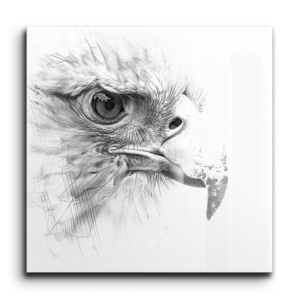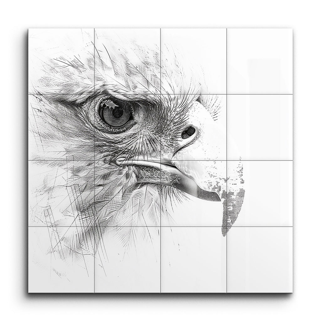 Elevate your space with this striking tile mural, showcasing a mesmerizing close-up of an eagle's head. The eagle's intense, piercing eye draws you in, while the meticulously illustrated feathers around the eye and beak highlight the bird's majestic power. Combining realism with a sketch-like quality, the detailed rendering of the eagle contrasts beautifully with the abstract, loosely drawn feathers. This dynamic artwork captures the essence of the eagle, making it a compelling focal point for any room.