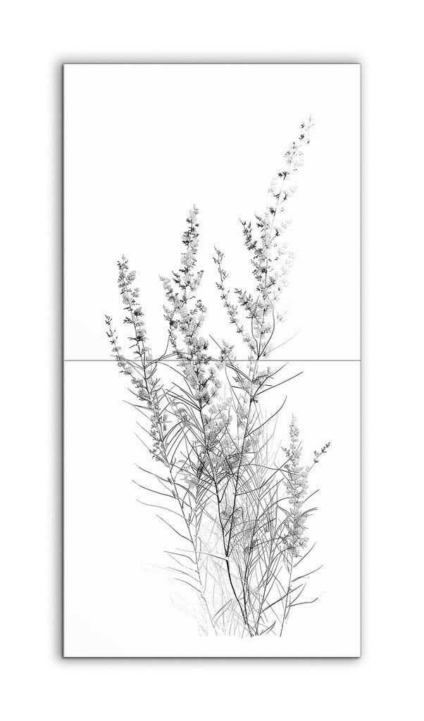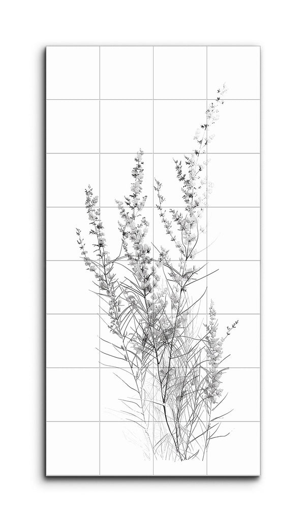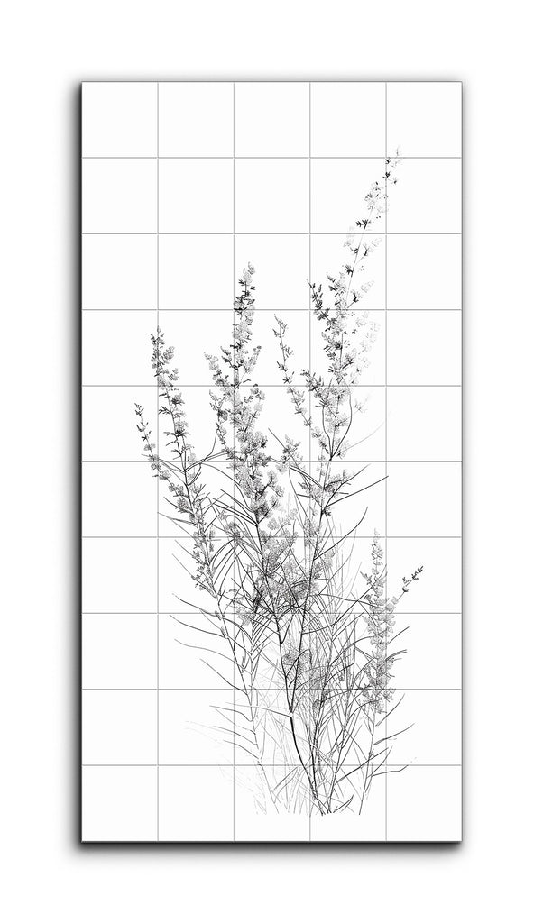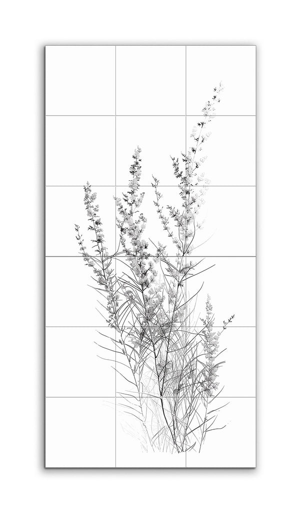 This tile mural showcases a delicate and detailed botanical rendering, featuring slender stems with small leaves and clusters of tiny buds. The minimalist, monochromatic style employs fine, precise lines, creating a sense of lightness and intricacy. With a balanced composition and prominent use of negative space, the artwork highlights the elegant and serene beauty of the plants. Varying line thickness adds depth and texture, capturing the fragile essence of the botanical forms in a refined manner.