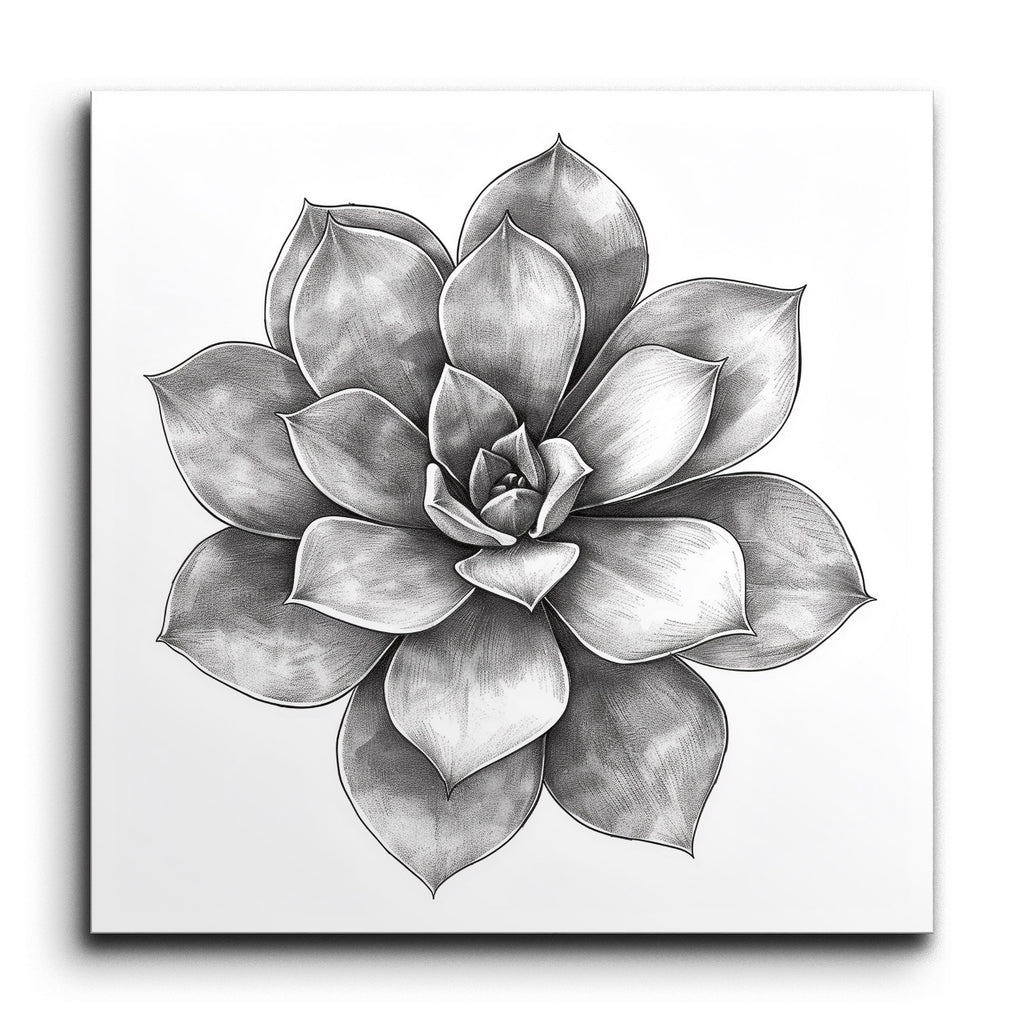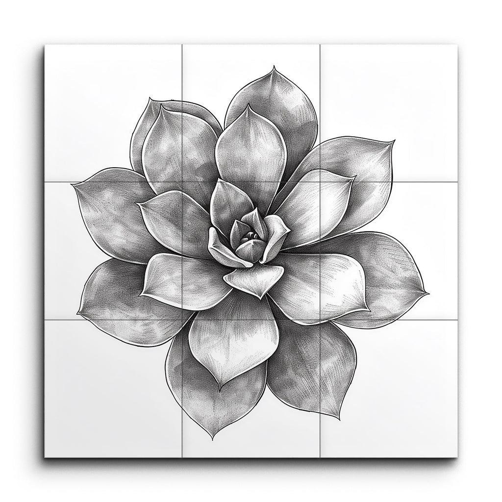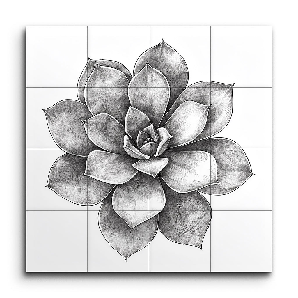 Immerse yourself in the elegance of nature with this exquisite tile mural featuring a detailed and realistic illustration of a succulent plant. Rendered in timeless black and white, this monochromatic masterpiece captures the intricate beauty of each leaf with meticulous shading and fine lines. The rosette pattern of the succulent, with its outer leaves spreading gracefully and inner leaves tightly packed, creates a captivating sense of depth and dimension, making this artwork a stunning focal point for any space.