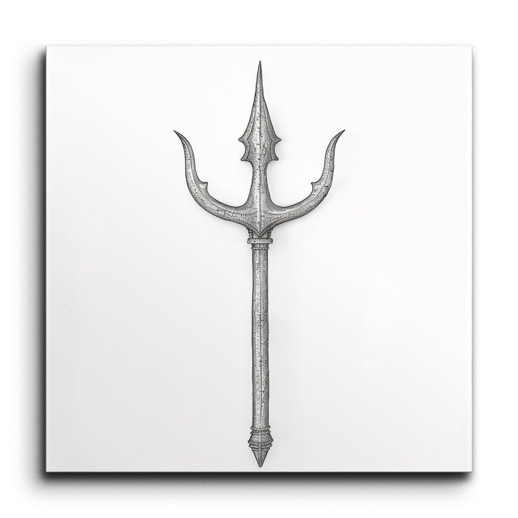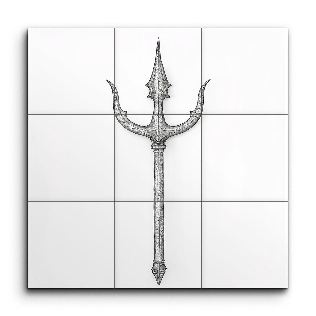Immerse yourself in the elegance of our stunning tile mural, featuring an exquisitely detailed trident. The central prong, adorned with serrated edges and a textured metallic surface, is flanked by two shorter, curved prongs, creating a striking focal point. The intricately designed handle, with its ornate patterns and depth, culminates in a decorative finial. This artwork combines realism and craftsmanship, capturing the beauty and intricacy of the trident in a lifelike, three-dimensional style.