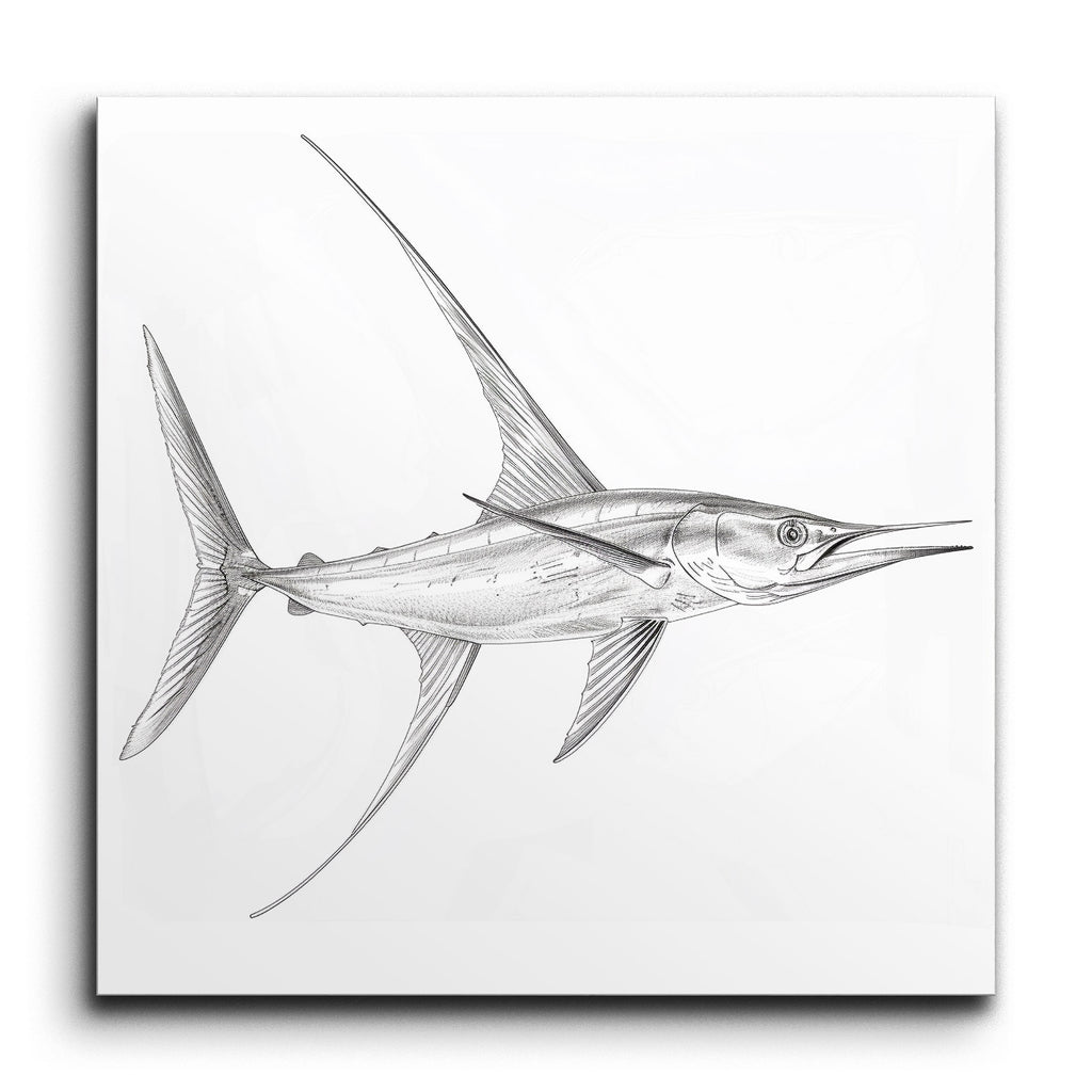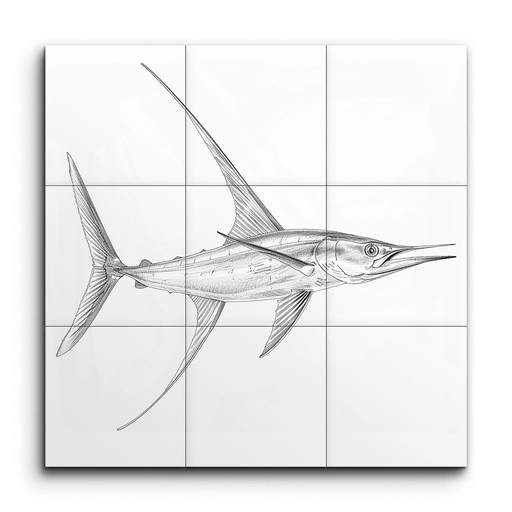 Dive into the depths of elegance with our stunning tile mural featuring a meticulously detailed illustration of a swordfish. Captured in a monochromatic palette, this artwork showcases the swordfish in profile, highlighting its elongated body and iconic pointed bill. The intricate line work and shading bring out the texture of the scales, the power of the forked tail, and the grace of the fins, reminiscent of scientific illustrations. Perfect for adding a touch of marine sophistication to any space.