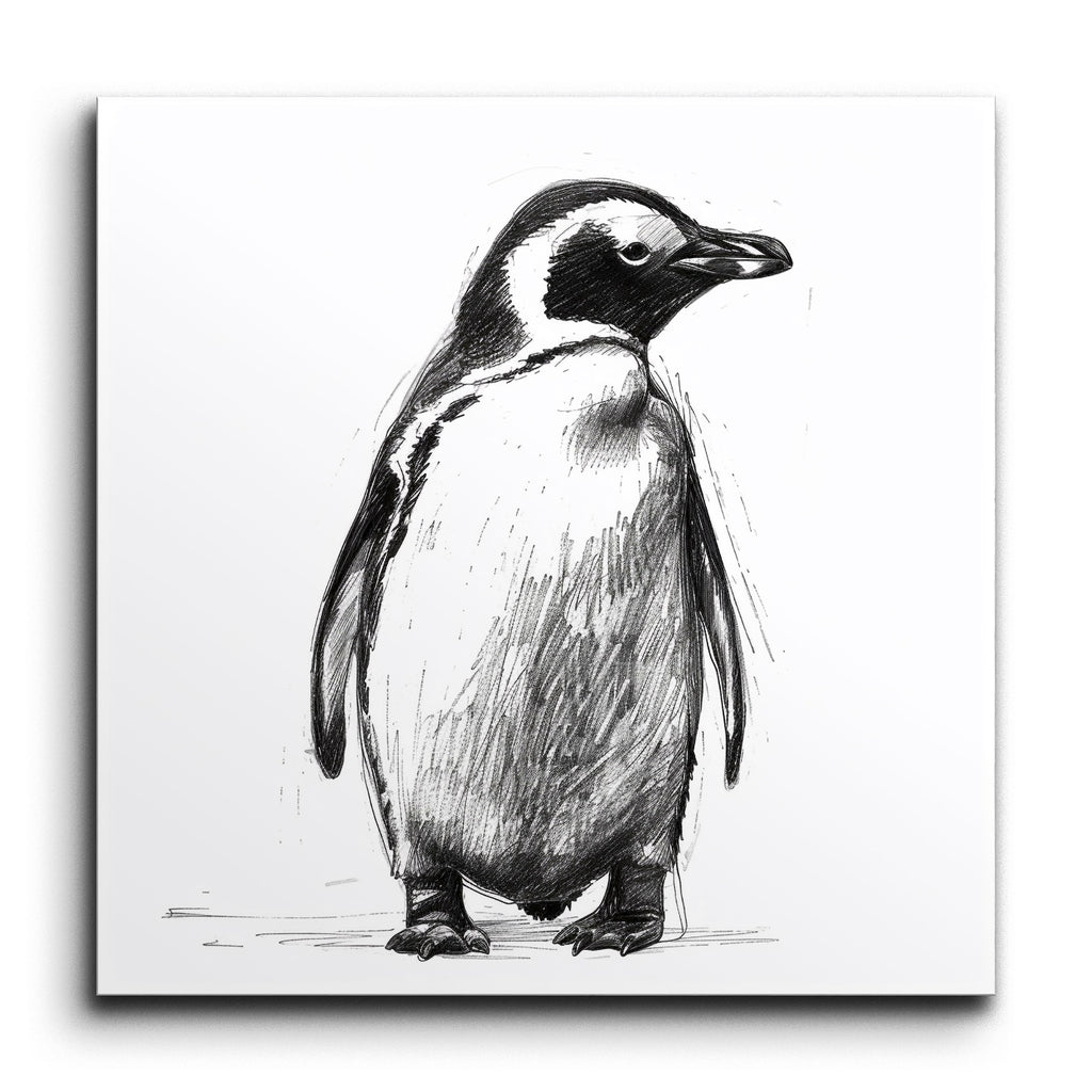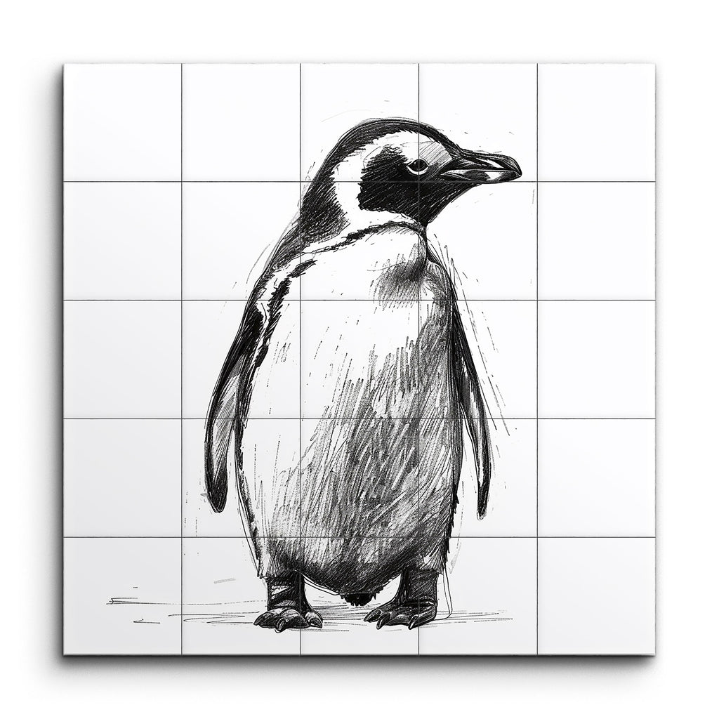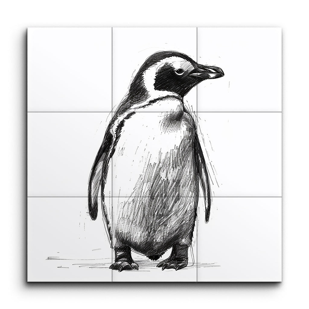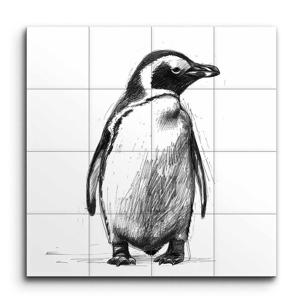 Transform your space with this captivating tile mural featuring a black and white illustration of a penguin. This exquisite piece, reminiscent of pen and ink drawings, showcases intricate details through fine lines and cross-hatching techniques. The penguin stands upright with flippers slightly extended, highlighting the artist's meticulous attention to the textures of its feathers and the smoothness of its head. The stark contrast between dark and light enhances the three-dimensionality, making the penguin come to life. This minimalist yet striking composition will add a touch of elegance and sophistication to any setting.