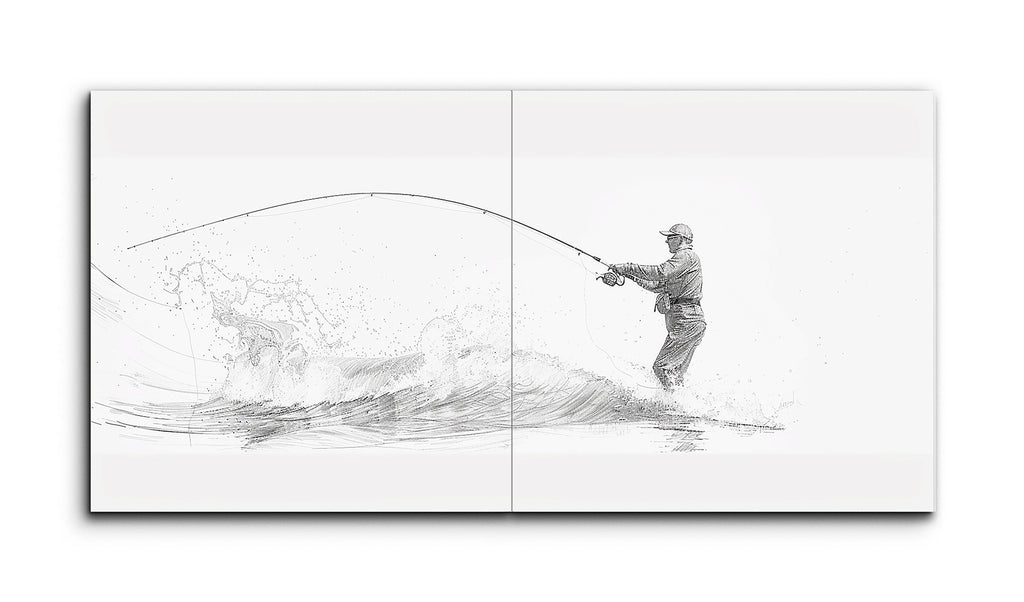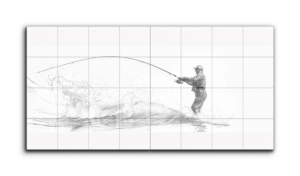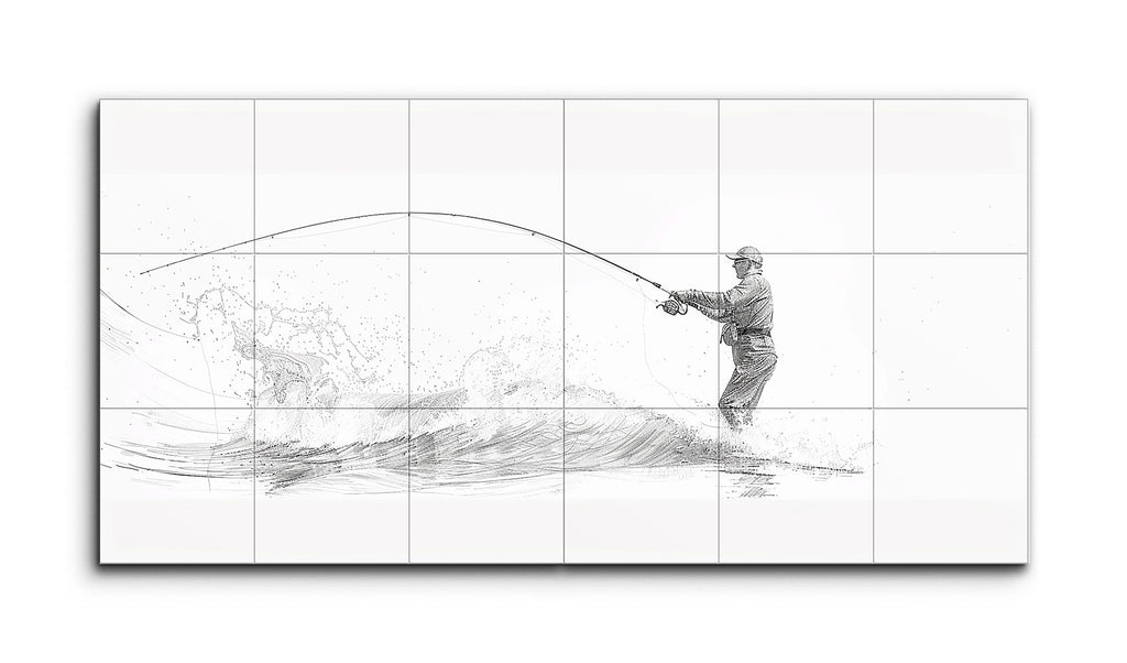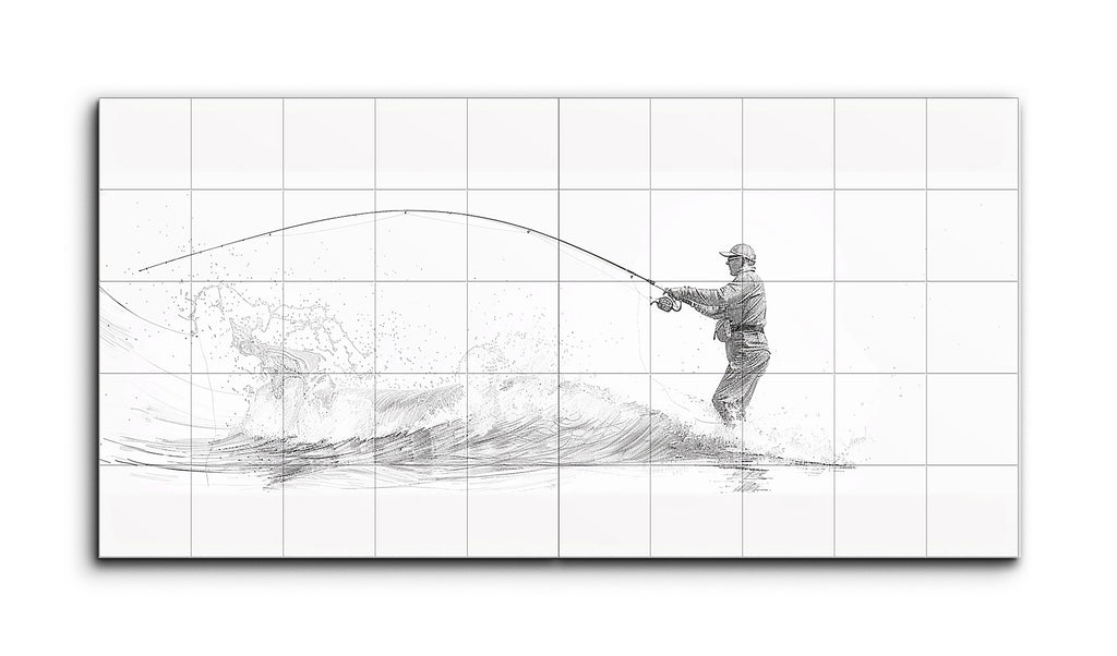 This tile mural showcases a minimalist, sketch-like depiction of a fisherman standing in water, casting his line. The fine lines and subtle shading capture the fisherman's posture and the dynamic motion of the curved fishing rod. Sweeping lines and splashes suggest the water's movement, adding texture and depth. The balanced composition, with the fisherman to the right and the line extending left, guides the viewer's eye, while the monochromatic palette and negative space enhance the clean, elegant aesthetic.