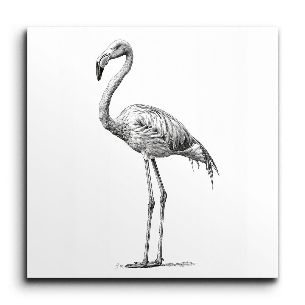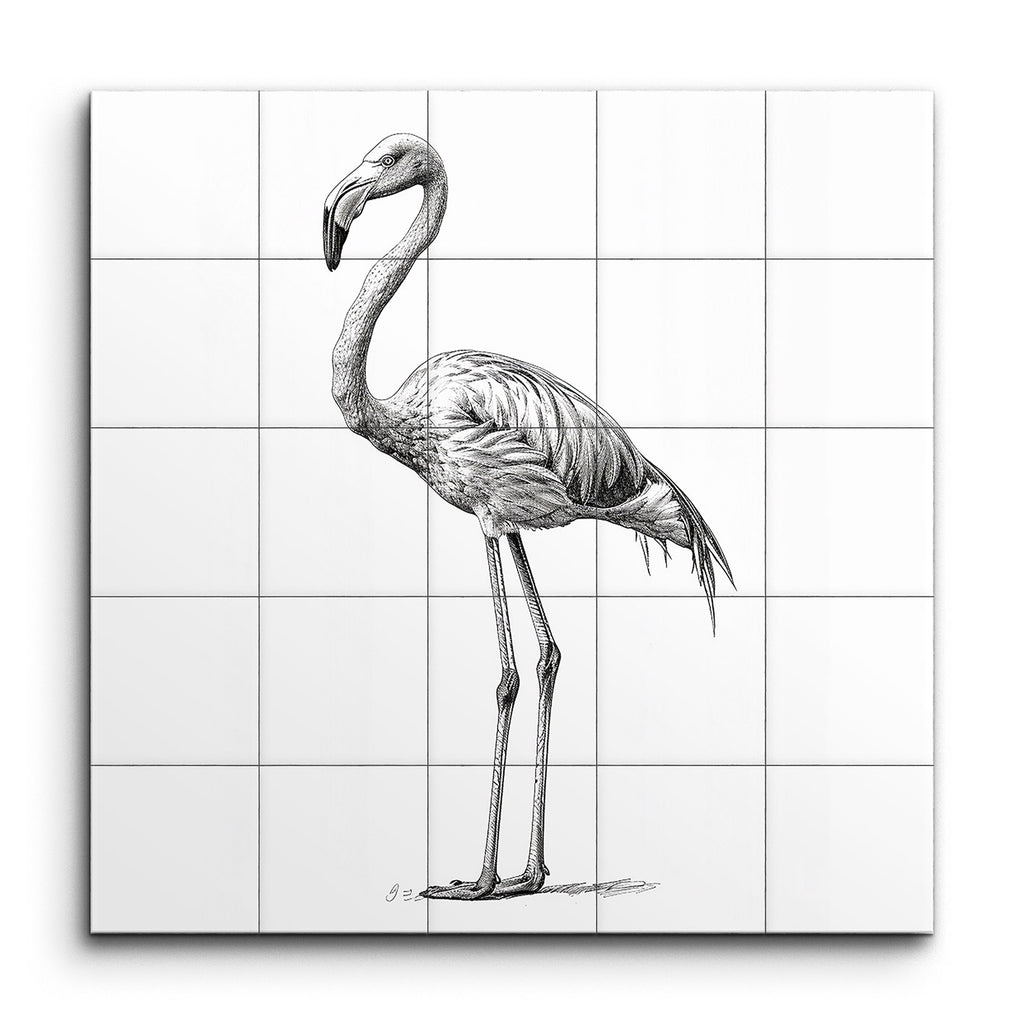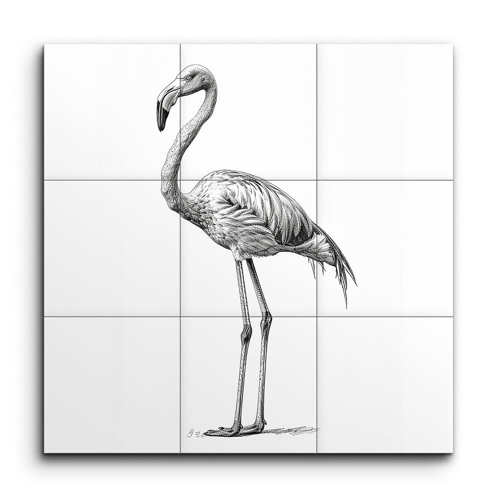 This tile mural features a detailed monochromatic illustration of a flamingo. The bird is depicted in a side profile, showcasing its long, slender legs and elegantly curved neck. Fine lines and intricate shading capture the texture of the flamingo's feathers, highlighting subtle variations in its plumage. Cross-hatching and stippling techniques add depth, creating a realistic yet stylized look. The elegant and minimalist composition emphasizes the flamingo's natural beauty and form.