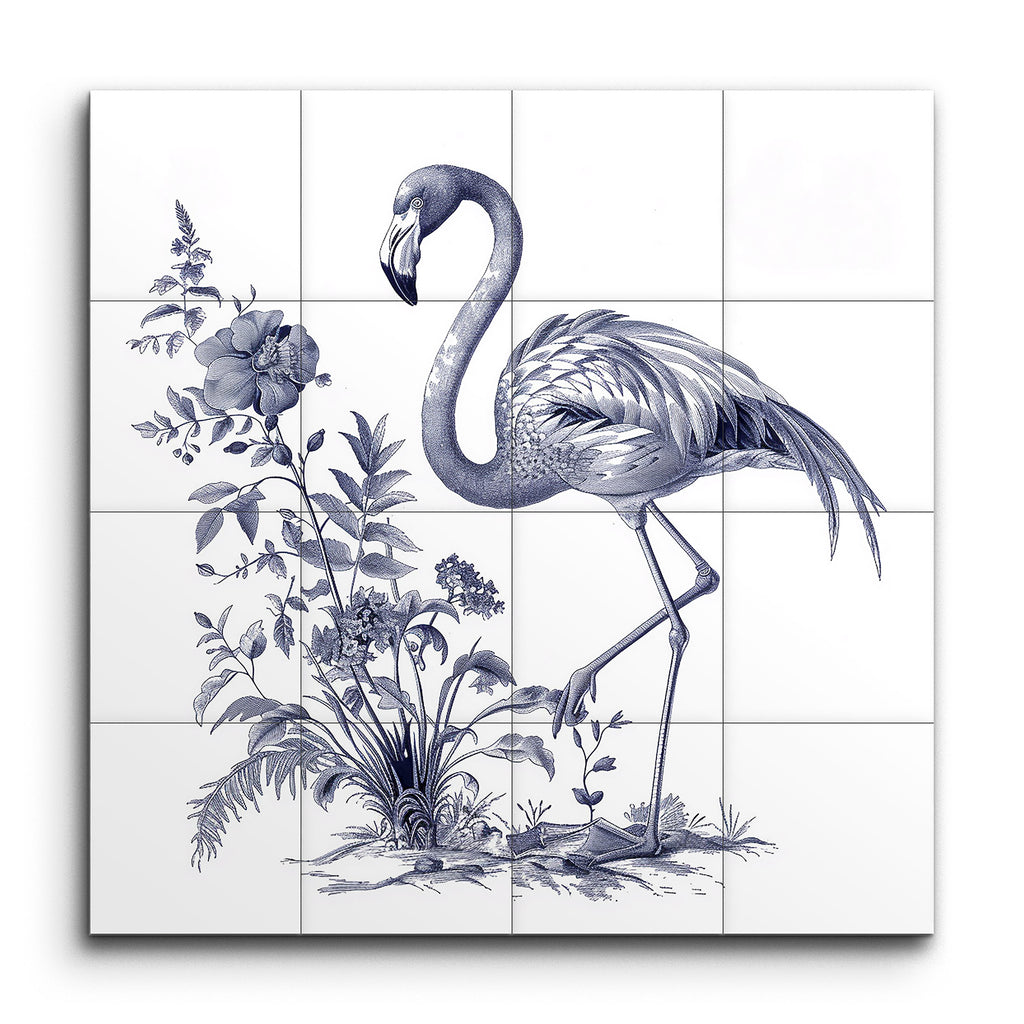 This tile mural presents a stunning monochromatic illustration of a flamingo poised elegantly on one leg. The artwork captures the intricate texture and pattern of the flamingo's feathers in exquisite detail. Beside the bird, a cluster of diverse plants and flowers is depicted with the same meticulous precision. The style echoes classic botanical illustrations, with fine lines and shading creating a delicate, elegant composition. The grayscale palette enhances the timeless quality and harmony of the scene.