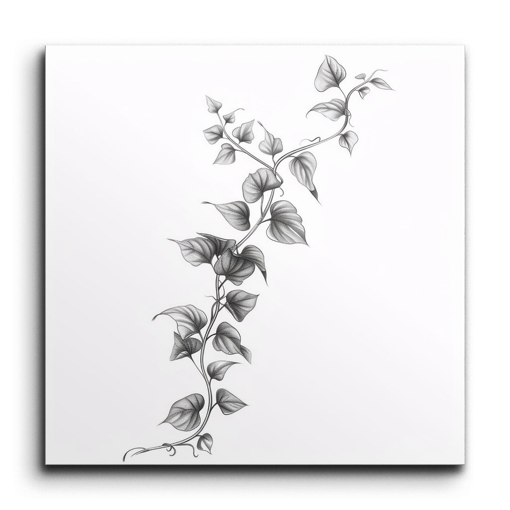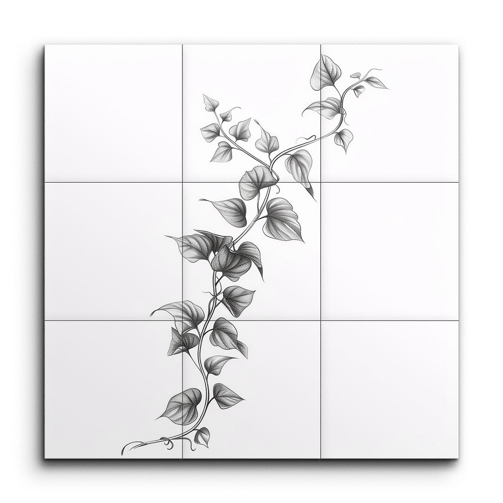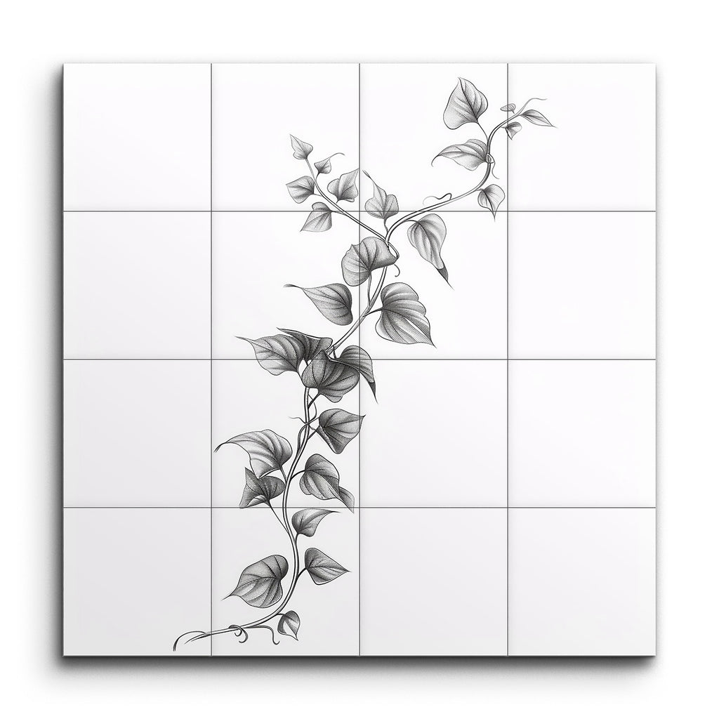 Transform your space with this elegant tile mural, featuring a delicate and intricate illustration of a vine with leaves. The artwork captures the organic movement of the twisting vine, with each leaf meticulously detailed in fine lines to create realistic texture and depth. The minimalistic and sophisticated grayscale tones enhance the natural beauty of the design, with soft shading giving the leaves a three-dimensional appearance. The balanced composition and diagonal flow of the vine add a touch of harmony and visual appeal.
