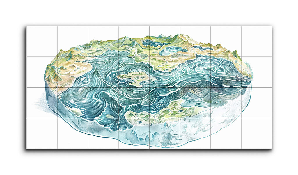 This tile mural presents a stylized topographical map of a landmass surrounded by water, divided into two panels. The land is depicted with colors indicating various elevations—yellows and greens for higher terrain, transitioning into blues and greens for lower areas, mimicking physical maps. The water features dynamic, swirling patterns of blue and green with white lines suggesting waves or currents. The abstract style emphasizes form, color, and pattern, creating a visually engaging and informative piece.