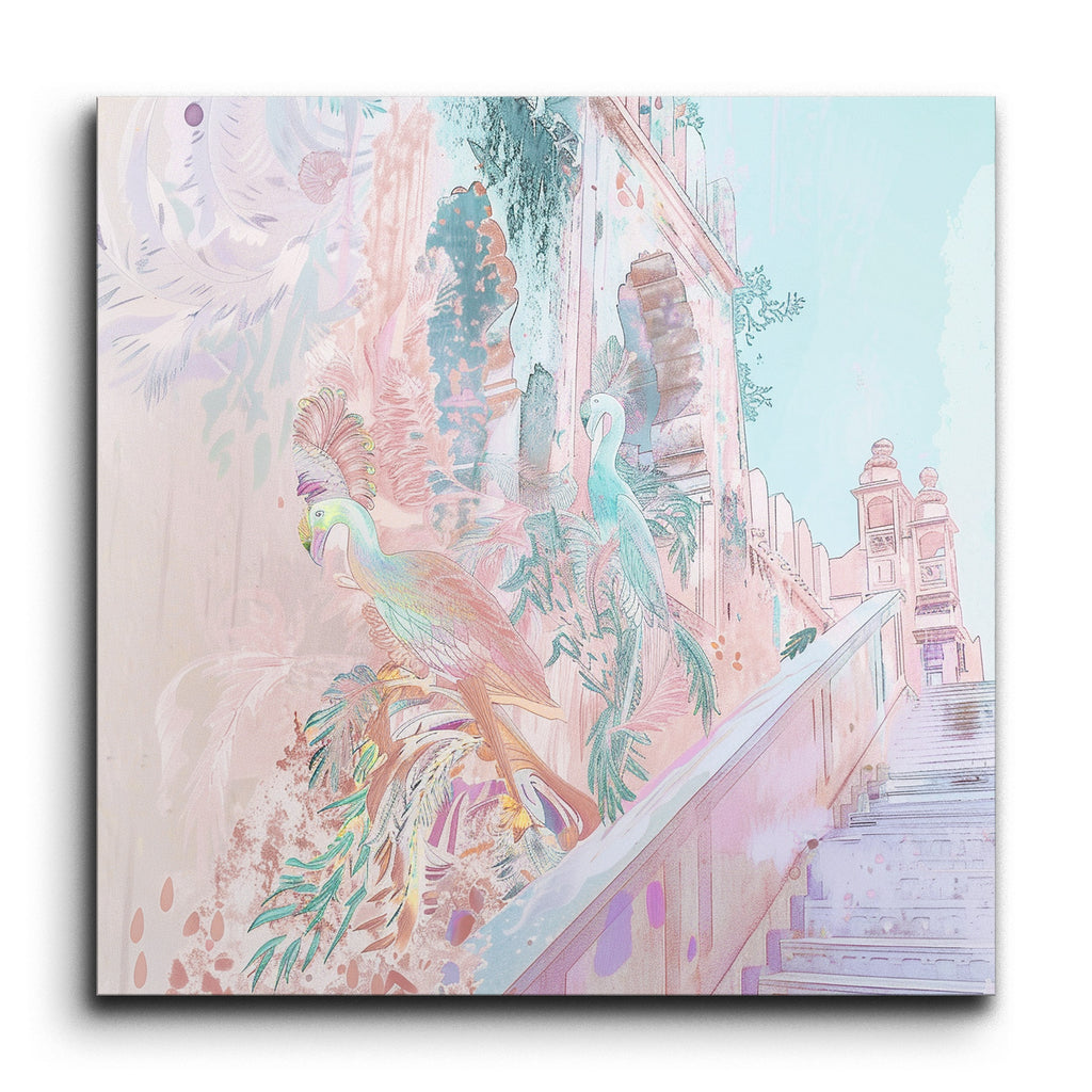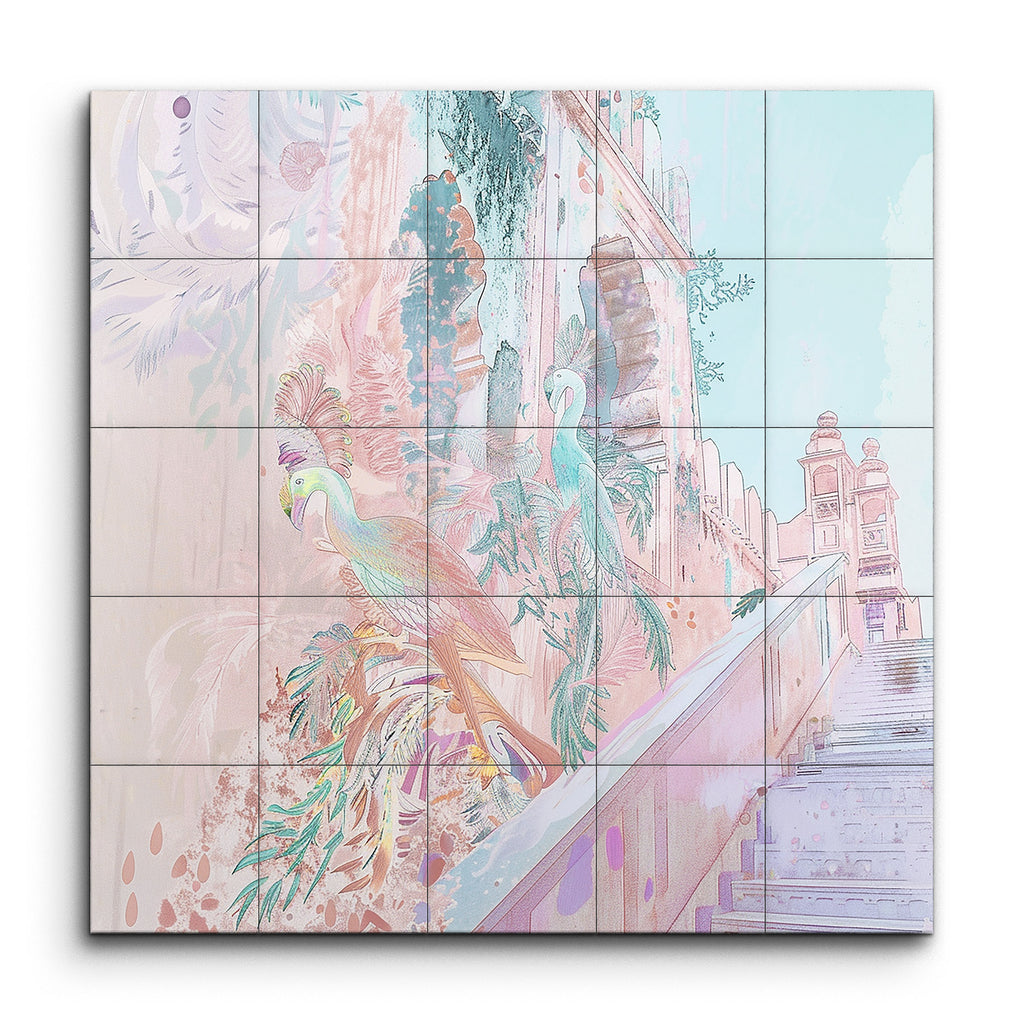 Transform your space with this enchanting tile mural featuring two vibrantly colored birds, reminiscent of peacocks, nestled against a backdrop of majestic architectural elegance. Intricately detailed with a blend of pastel hues—pink, blue, and green—the birds exude a dreamlike quality, their feathers adorned in soft and vivid tones. The historical-inspired structures with arches and stonework, along with stairs leading into the scene, offer depth and a tranquil, almost surreal atmosphere.