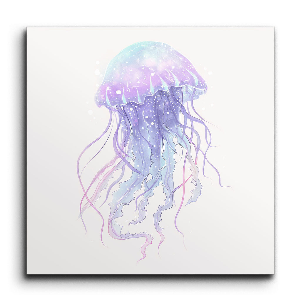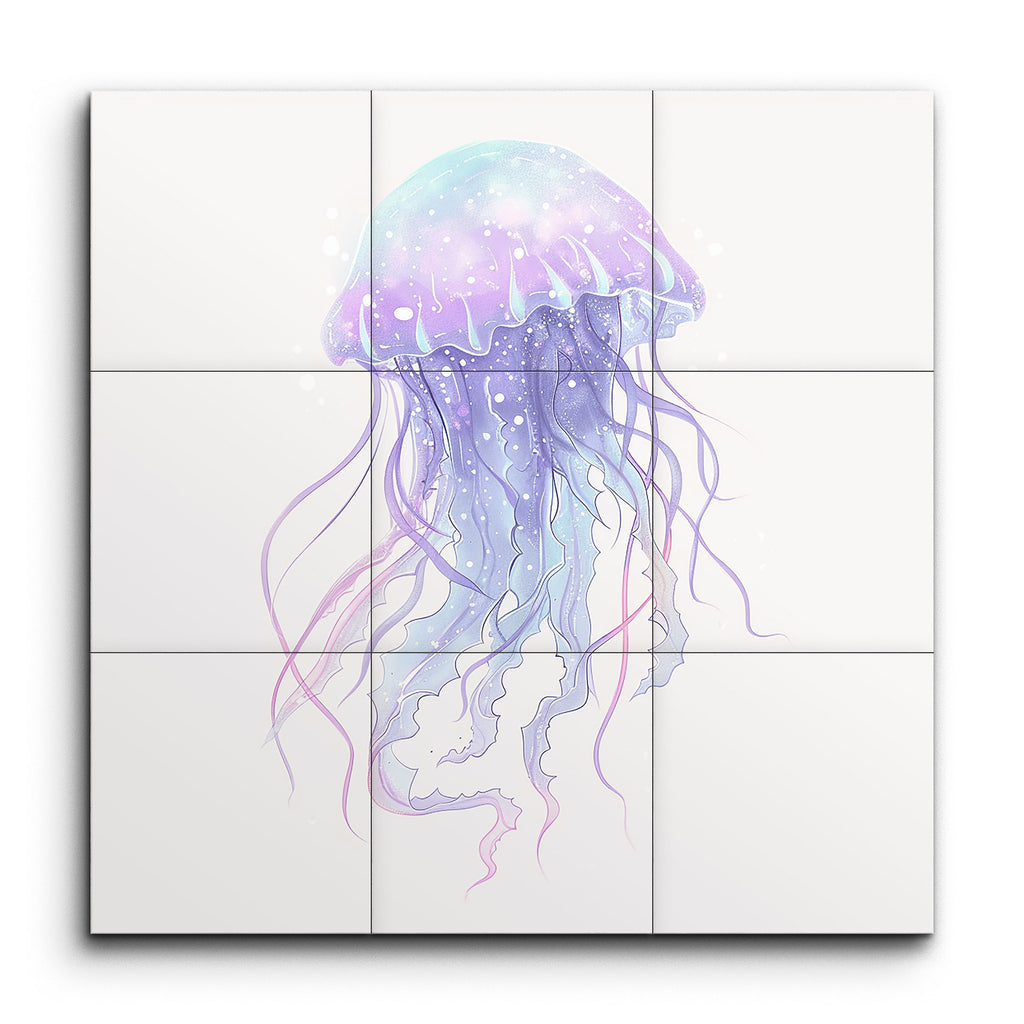Transform your space with this enchanting tile mural, featuring a delicate and ethereal jellyfish. Rendered in soft pastel hues of purple, blue, and pink, the semi-transparent bell blends seamlessly into a dreamy gradient. The long, flowing tentacles, depicted with fine, wispy lines, add a sense of movement and fluidity. A soft glow and scattered white specks enhance the underwater ambiance, evoking a serene and whimsical atmosphere that inspires calm and wonder.