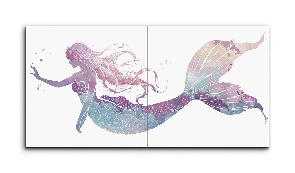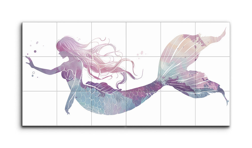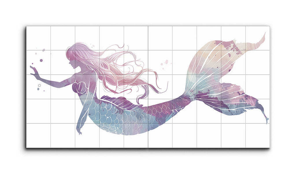 This tile mural showcases a stylized mermaid in side profile, gracefully swimming to the left. Her human-like upper body transitions seamlessly into a detailed, geometric-scaled fish tail that ends in an elegant, flared fin. The soft pastel palette of purples, pinks, and blues blends harmoniously, while her long, flowing hair and subtle bubble accents enhance the underwater theme. The image's translucent, ethereal quality and modern digital design evoke a sense of fantasy and mythical allure.