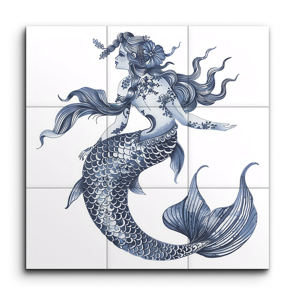 Immerse yourself in the enchanting world of our tile mural, featuring a captivating illustration of a mermaid. Rendered in a blend of realism and fantasy, the mermaid is depicted in a side profile with her upper body turned slightly towards the viewer. Her long, flowing hair, adorned with delicate floral elements, cascades gracefully, adding a sense of movement. The detailed scales on her tail and the seamless floral patterns on her upper body enhance her ethereal beauty, while the serene shades of blue create a tranquil atmosphere. This mural is a harmonious blend of natural elegance and mythical allure, perfect for adding a touch of sophistication to any space.