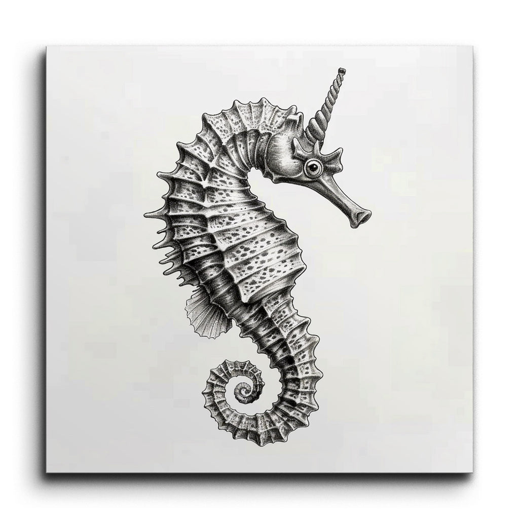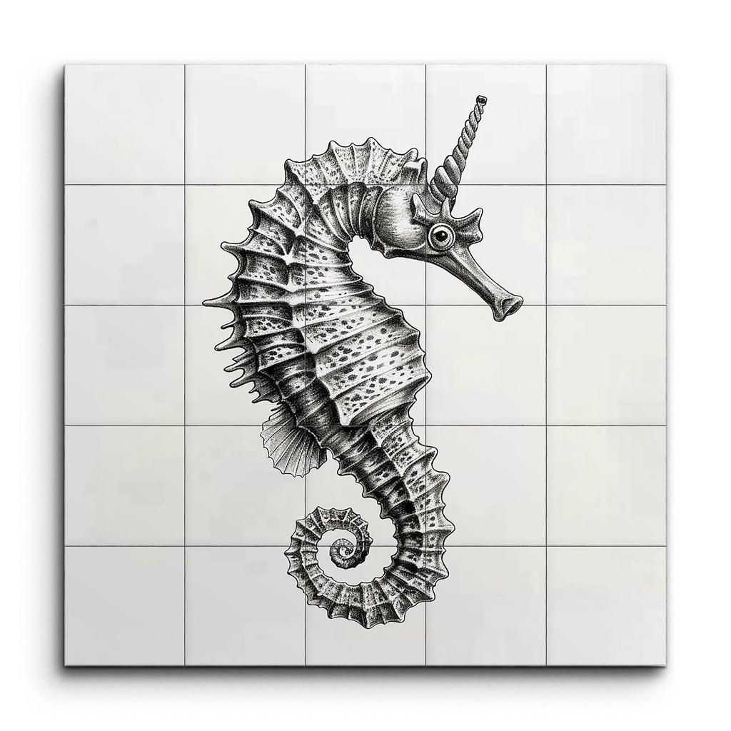 Immerse yourself in an oceanic fantasy with this stunning tile mural featuring a seahorse with a unicorn horn. The artwork showcases meticulous detailing, from the seahorse's textured skin and ridged body to its tightly coiled tail. The realistic rendering brings depth and dimension, while the whimsical unicorn horn adds a magical touch. Expressive eyes give the creature a captivating personality, making this mural a striking blend of realism and imagination that will enchant any space.