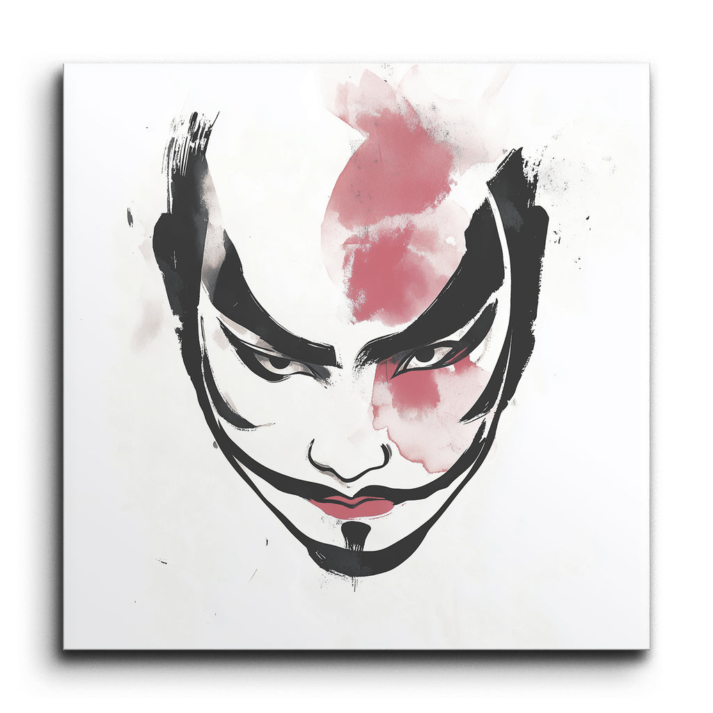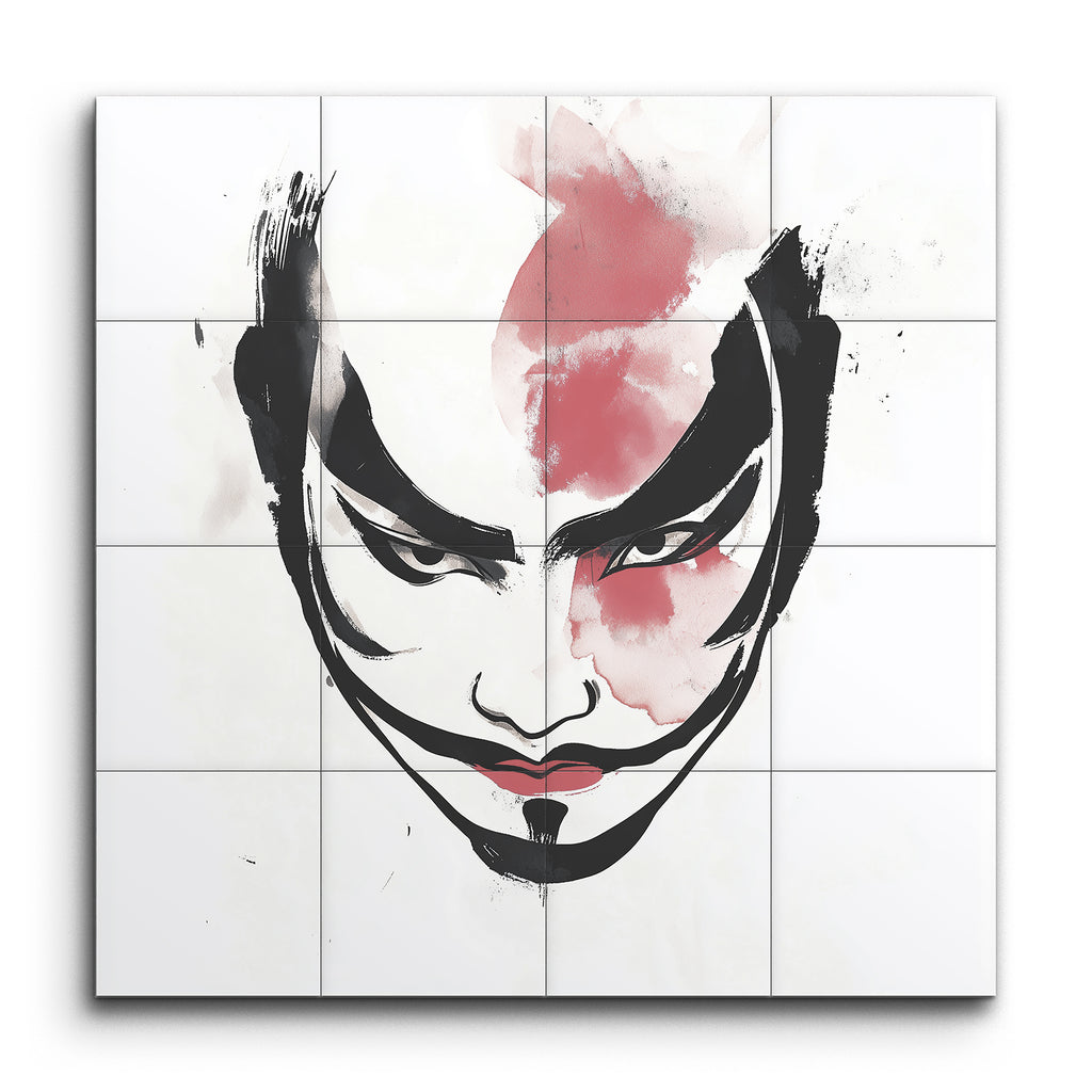 This tile mural showcases a captivating face rendered in a stylized, minimalist fashion. Bold, sweeping brushstrokes define the intense expression, with thick black lines accentuating the facial features. A striking red wash across one side of the face adds depth and contrast, drawing the eye. The artwork merges traditional Asian ink painting with a modern twist, balancing fluidity and precision. Negative space enhances the focus on the face, imbuing the piece with a powerful and enigmatic presence.