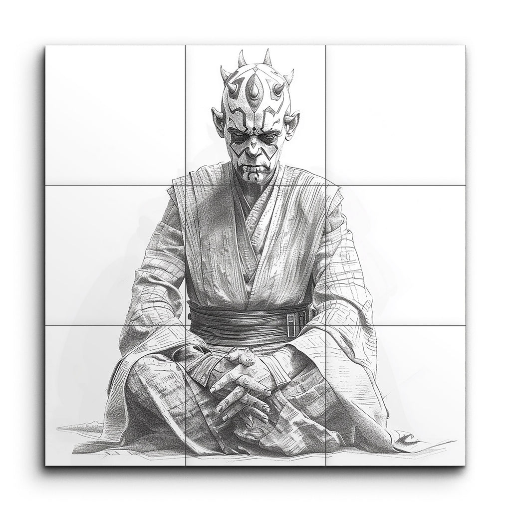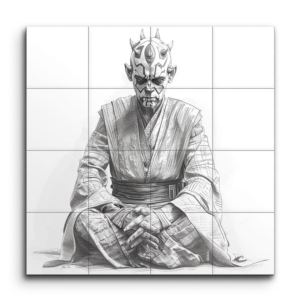 Immerse yourself in the captivating world of this intricate tile mural, featuring a mesmerizing pencil sketch of a character in deep meditation. The figure, robed in flowing, textured attire, exudes a realistic and tactile presence. Elaborate facial markings and menacing horns enhance the otherworldly essence, while meticulous shading and line work bring depth and dimension. This artwork masterfully captures the enigmatic aura and physical presence of the meditative character, making it a striking focal point for any space.