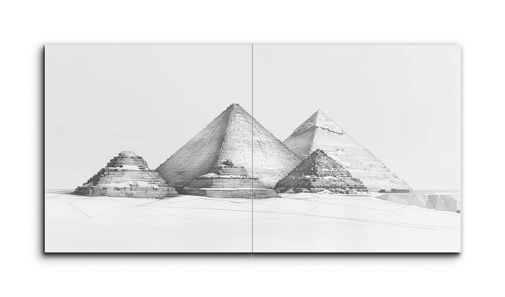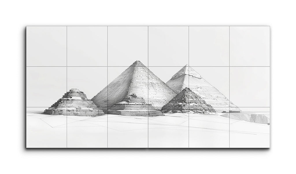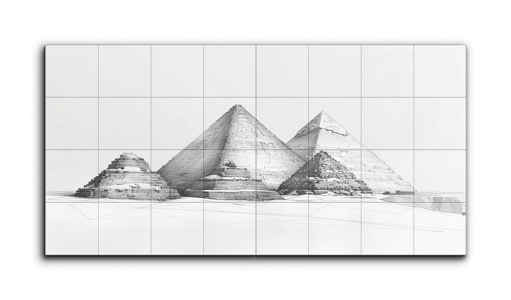 This tile mural presents a monochromatic depiction of the Egyptian pyramids, split across two canvases in a diptych format. Rendered with meticulous detail, the pyramids' iconic geometric forms and stone block layers are prominently featured. The precise, realistic style highlights the play of light and shadow, lending a serene and timeless quality to the scene. The balanced composition centers the largest pyramid, flanked by smaller ones, emphasizing their grandeur and historical significance.