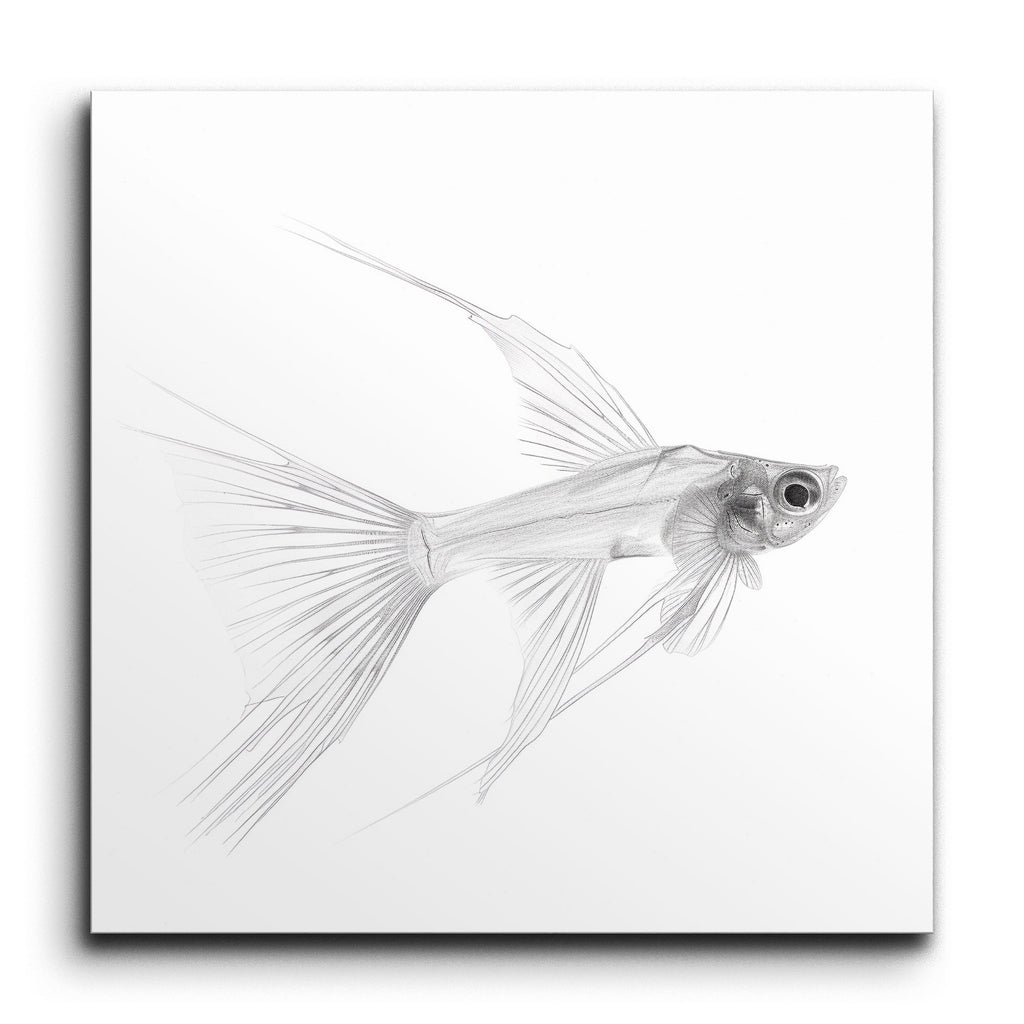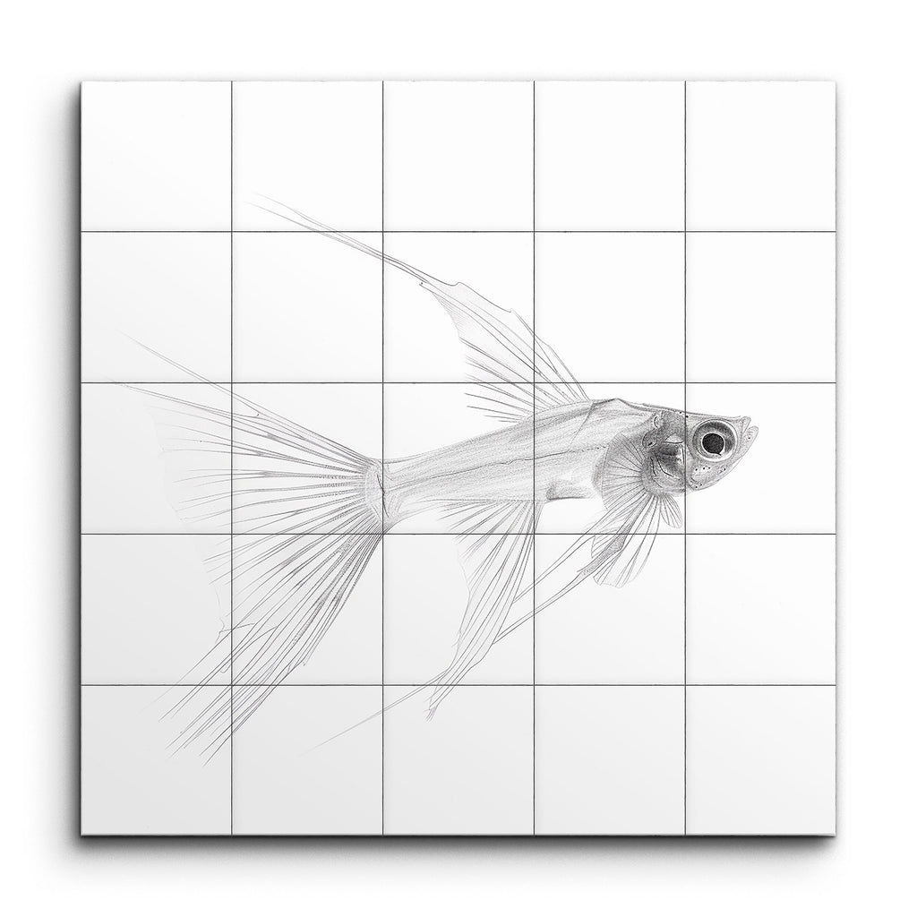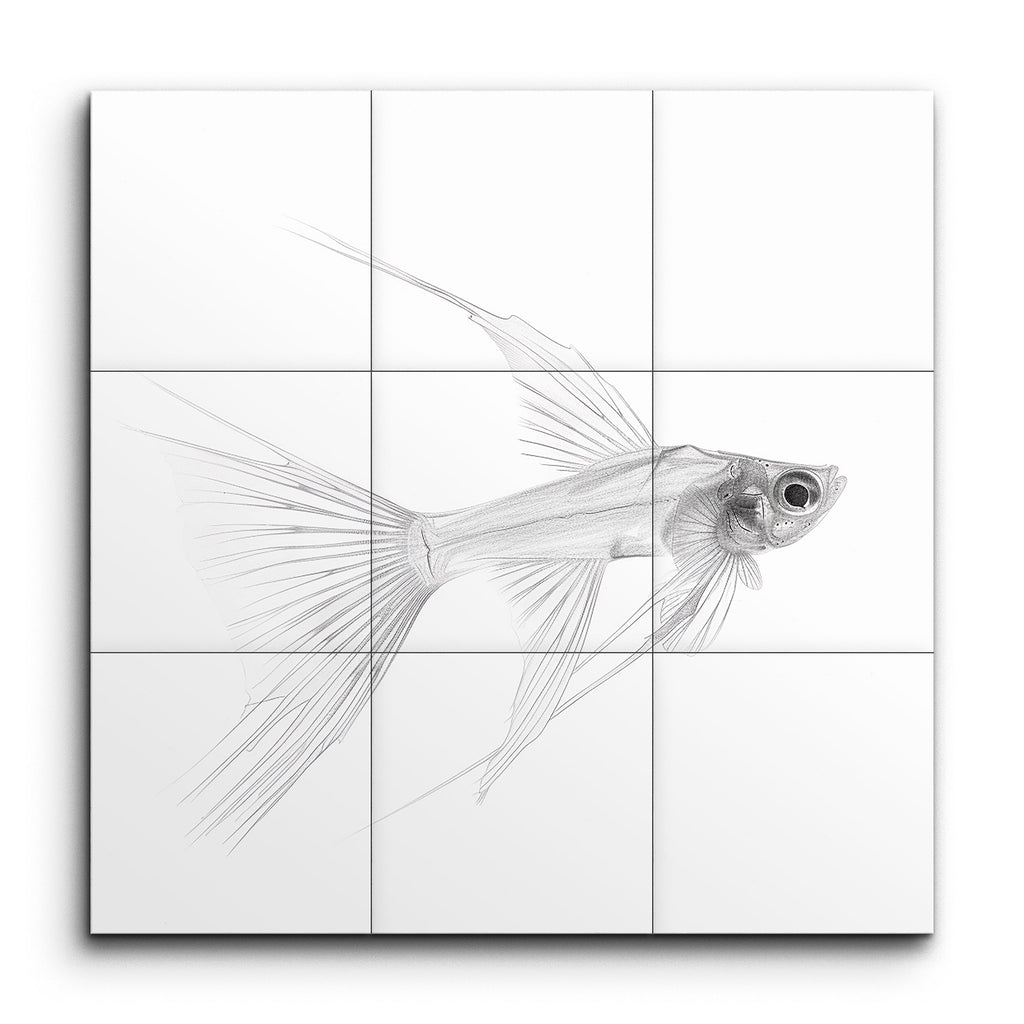 Transform your space with this exquisite tile mural featuring a delicate and intricately detailed angelfish, rendered in a refined monochromatic style. The fish's elongated body and flowing, wispy fins are depicted with clean, precise lines, creating a sense of ethereal beauty. The prominent, detailed eye adds a touch of realism to this minimalist composition. This artwork captures the serene elegance and tranquility of the fish, bringing a sense of calm and understated beauty to any setting.