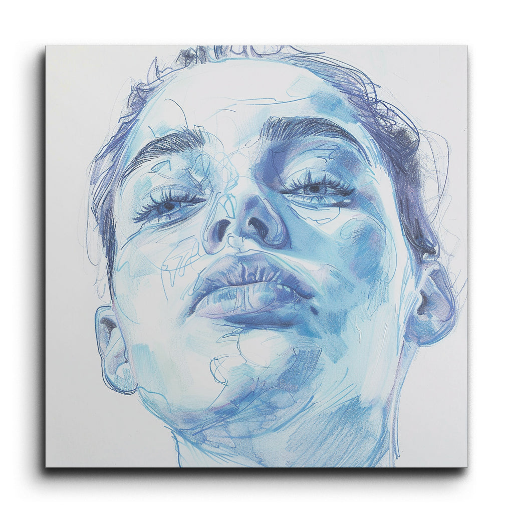 Elevate your space with this captivating tile mural featuring a close-up portrait that masterfully blends realism and sketch-like qualities. Rendered in soothing shades of blue, the artwork exudes an ethereal calm. The face, captured from a low angle, showcases detailed yet expressive lines that bring a sense of movement and fluidity. Closed eyes and parted lips suggest introspection, while the loosely sketched hair adds dynamic flair. This modern, contemporary piece is a perfect blend of tradition and abstraction.