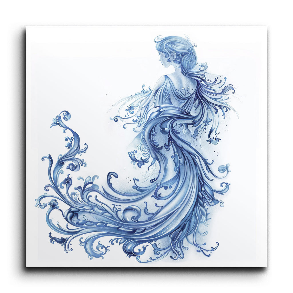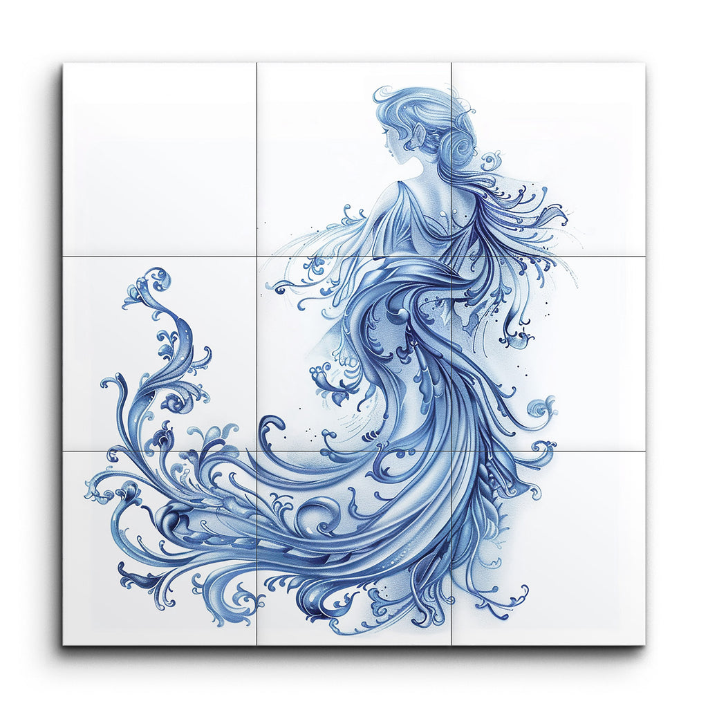 Immerse yourself in the mesmerizing world of our tile mural, featuring an ethereal female figure rendered in a flowing, fluid style. Intricate, swirling lines and patterns evoke both water and delicate filigree, enhanced by soothing blue tones that create a sense of movement and lightness. This partially abstract figure seamlessly blends into ornate swirls, suggesting a connection to nature or an otherworldly presence. The harmonious composition, reminiscent of Art Nouveau and modern digital illustration, captures beauty and tranquility.