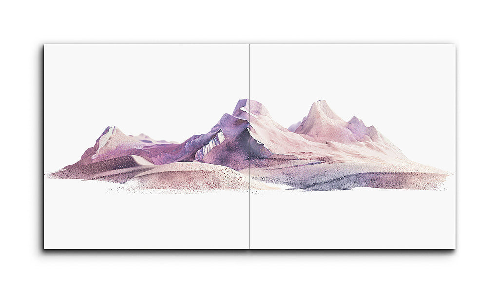 This diptych tile mural features an abstracted landscape, possibly of mountains, rendered in a minimalist style. Dominated by soft purples, pinks, and earthy tones, the composition flows seamlessly across two panels. Gentle brushwork and washes of color give the piece a dreamy, ethereal quality, emphasizing form and color over realism. The modern, abstract style evokes a serene, otherworldly landscape, creating a calming and meditative effect.